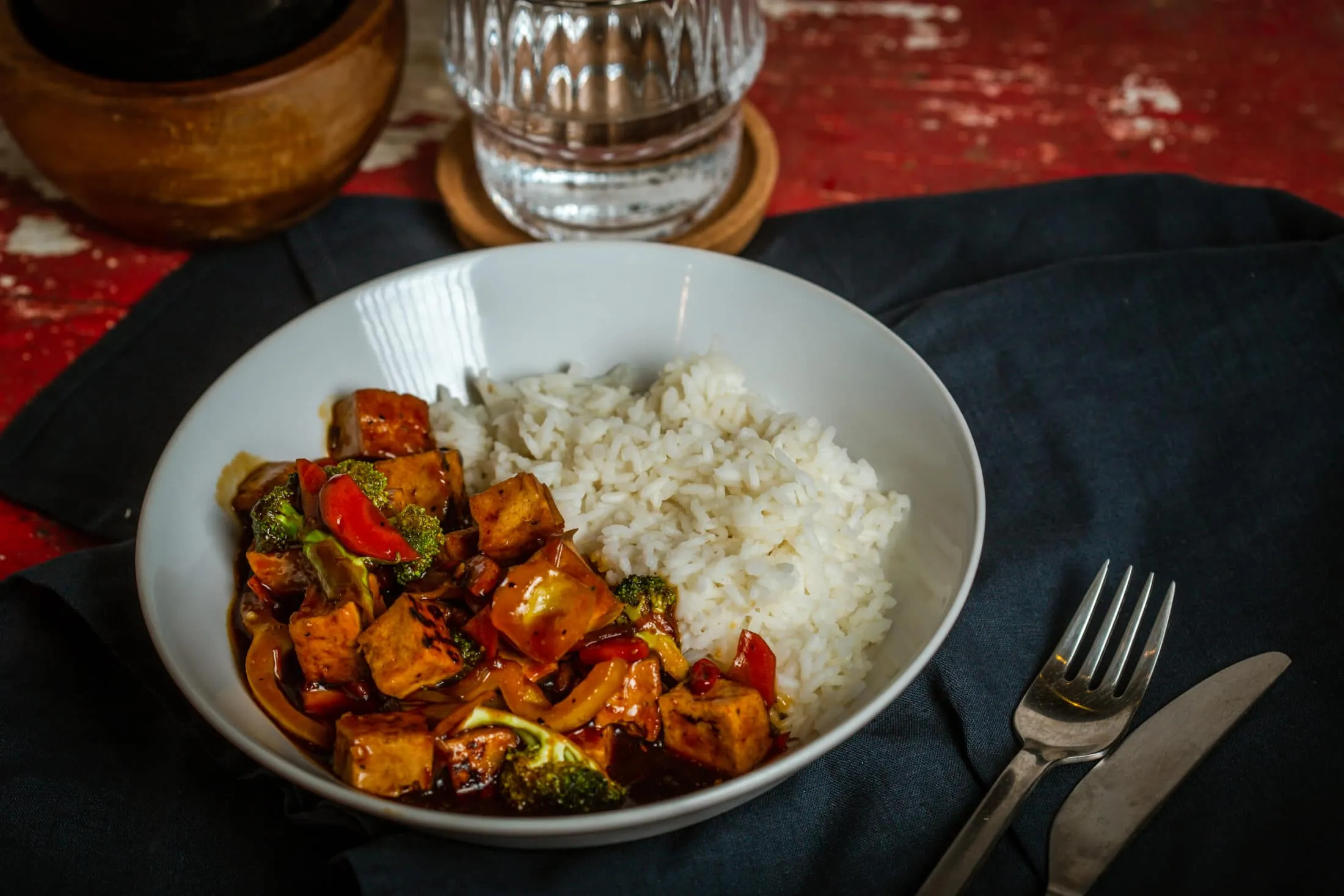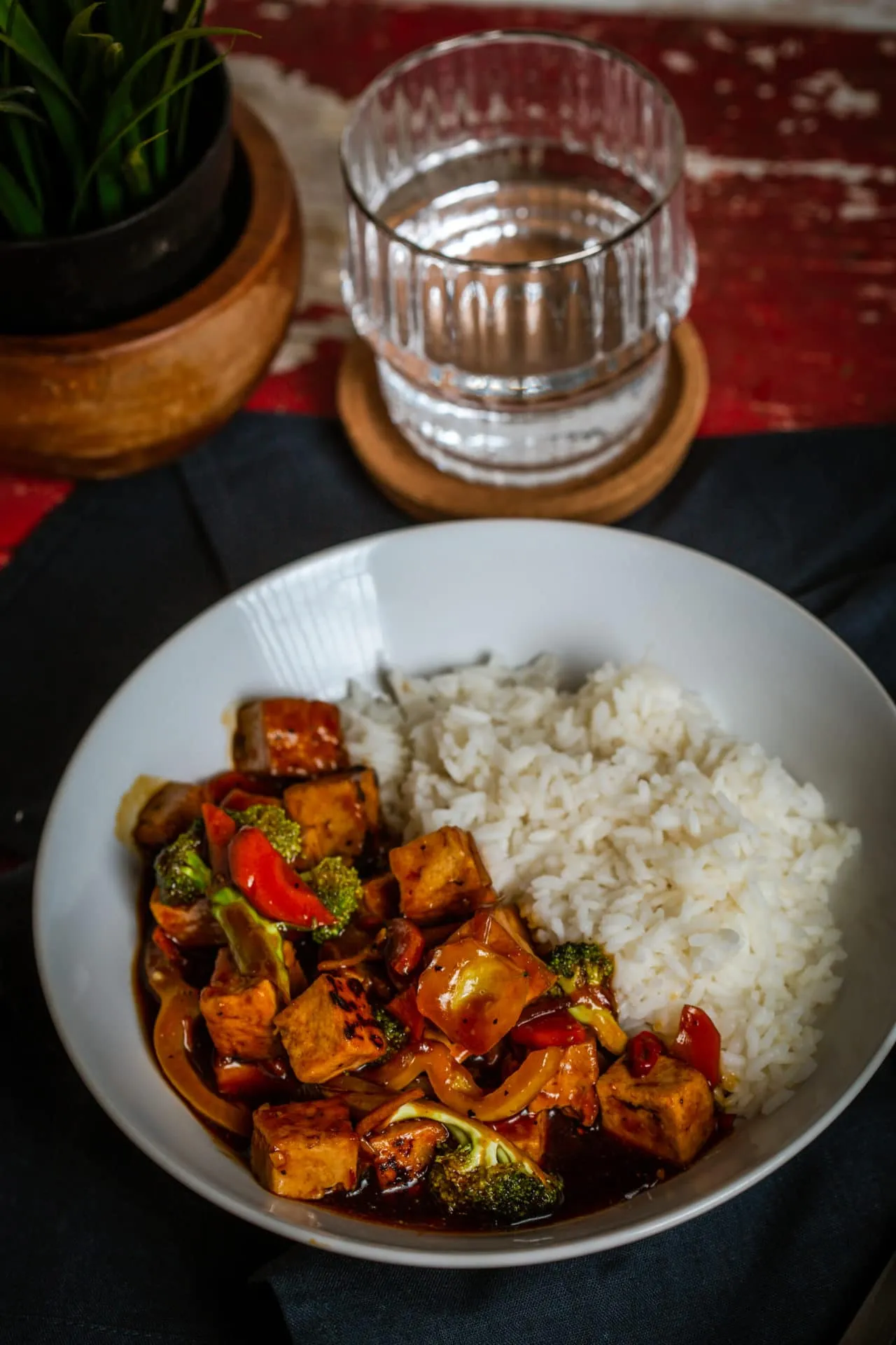 A szósz hozzávalóit összekeverjük. A tofut kb. 1 cm-es kockákra vágjuk. Egy serpenyőben egy kevés olajon megpirítjuk, majd kiszedjük, beleöntünk még 2-3 evőkanál olajat, rádobjuk a felszeletelt gyömbért, chilit és a hagymákat. Ezután jöhetnek a felszeletelt zöldségeket és a rózsáira szedett brokkoli. Kicsit megpirítjuk, sózzuk, borsozzuk, megszórjuk a keményítővel, majd ráöntjük a szószt és visszatesszük bele a tofut. Kicsit összeforraljuk, és a rizzsel tálaljuk.
