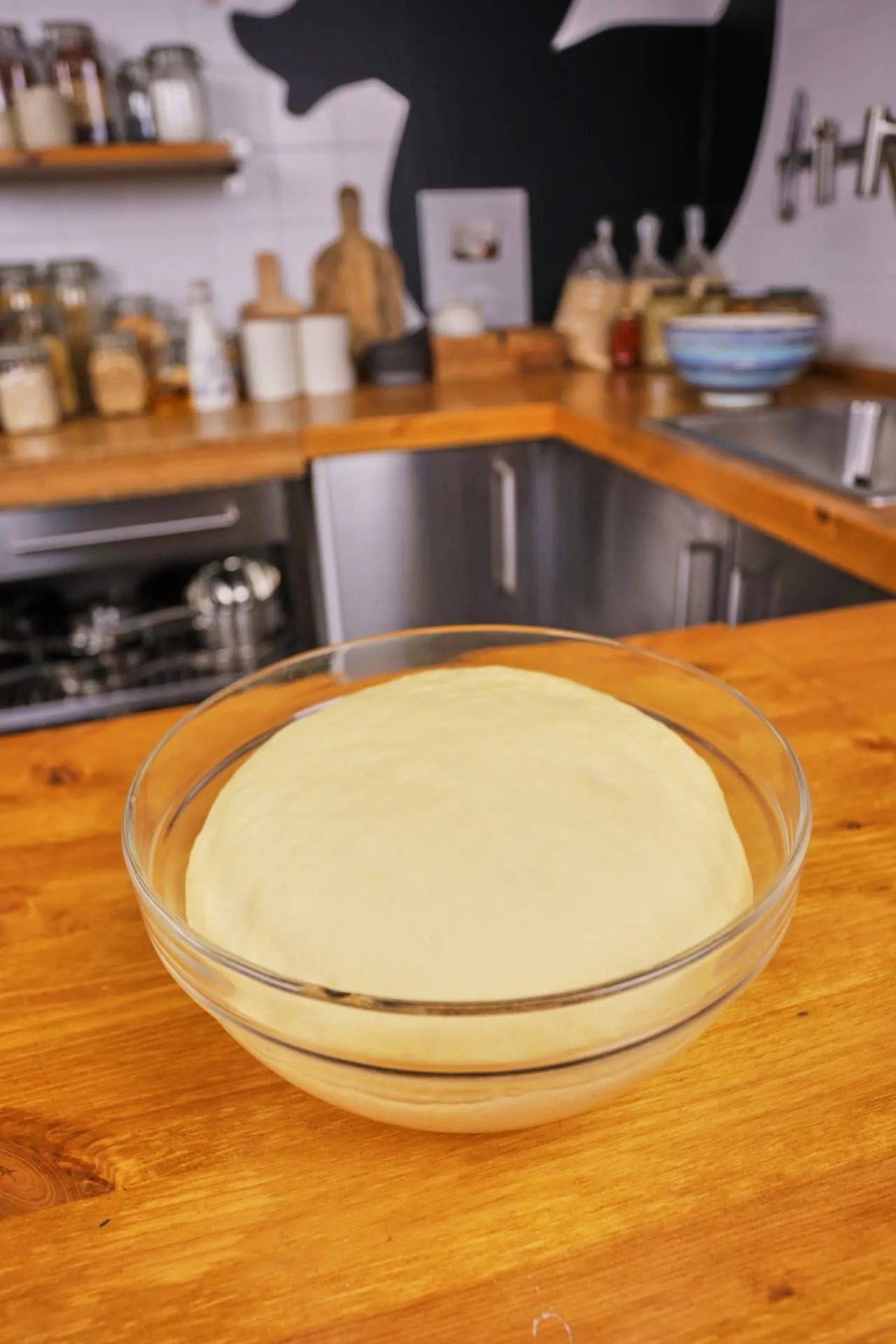 Egy fakanál segítségével átkeverjük a tésztát, majd ha már kissé összeállt, hozzáöntjük az olvasztott vajat, és alaposan átgyúrjuk még a tálban. Amikor összeállt, kirakjuk egy deszkára, vagy bármilyen más, sima konyhai felületre, és minimális lisztmennyiség hozzáadásával simára dagasztjuk. Fontos, hogy legalább 8-10 percig dagasszuk a tésztát, hogy kialakuljon a ruganyos szerkezete, és ne tapadjon a kezünkhöz. Ezután gombóccá formázzuk, egy enyhén kiolajozott vagy kilisztezett tálba rakjuk, lefedjük egy konyharuhával, és 40-50 perc alatt szélmentes, meleg helyen a duplájára kelesztjük.