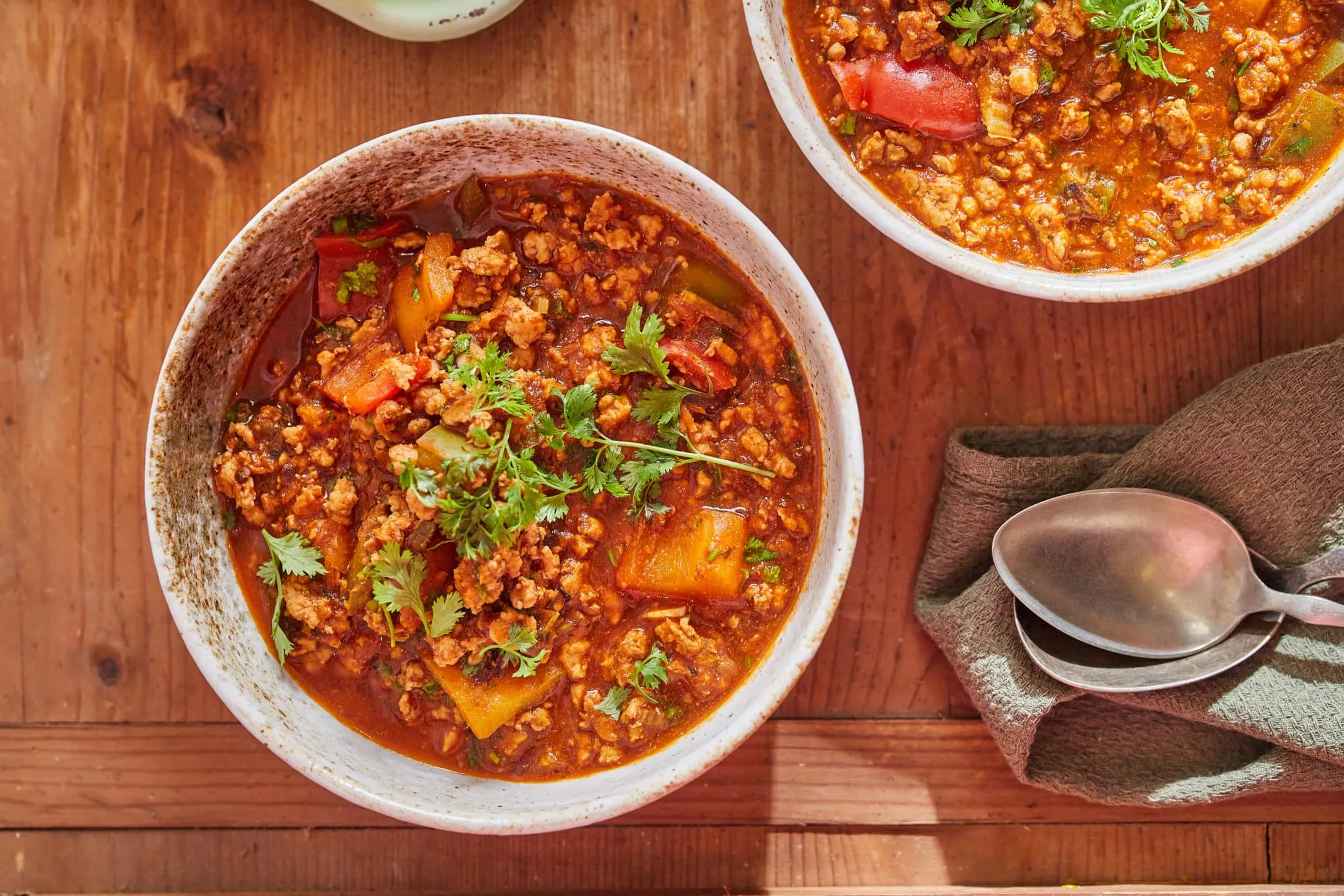 A tex-mex pulykachilihez a reszelt répát, a finomra vágott hagymát, fokhagymát és zellerszárat, valamint a felkockázott paprikát 10 perc alatt átpirítjuk az olívaolajon. Hozzádobjuk a darált húst, amivel újabb 5 percig pirítjuk. Jöhet rá az összes fűszer, sózzuk, borsozzuk, majd ráöntjük a vörösbort, amit elforralunk.