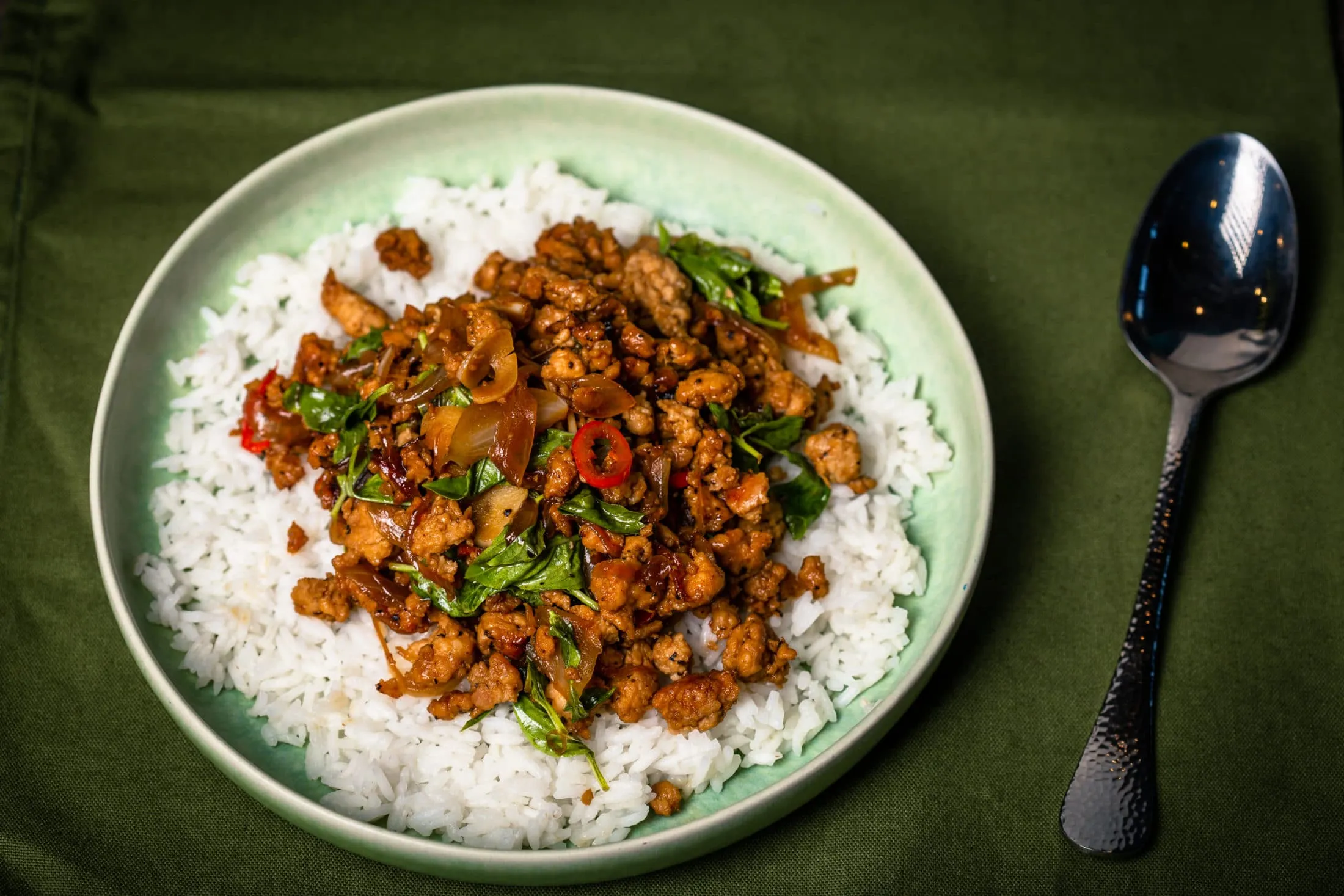 Az olajon elkezdjük pirítani a magas hőmérsékleten a darált húst, sózzuk, borsozzuk. Ha egy kicsit lepirult, mehet rá a felszeletelt hagyma, fokhagyma, chili és az összes alapanyag, kivéve a bazsalikom. Addig pirítjuk, amíg a hagyma is kicsit meg nem pirul, ekkor mehet rá a bazsalikomlevél. Összeforgatjuk, és rizzsel tálaljuk.