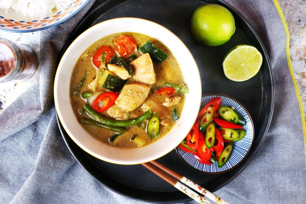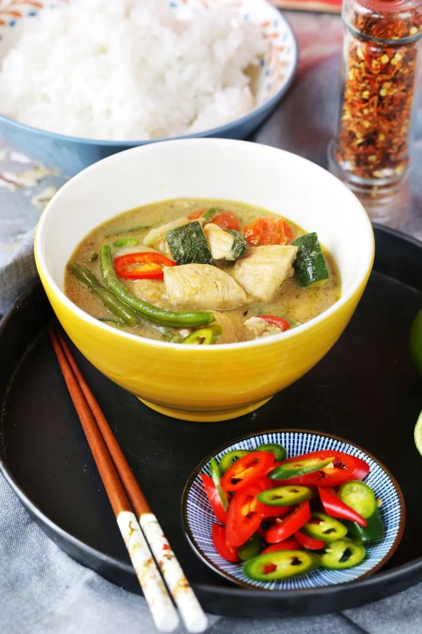 A thai zöld curry elkészítését azzal kezdjük, hogy a fokhagymát és gyömbért lereszeljük, a chilipaprikát vékony karikákra vágjuk és kevés olajon lepirítjuk őket. A csirkemellet kockákra vágjuk, a serpenyőbe dobjuk és fehéredésig pirítjuk. Ezután jöhet is a húshoz a fő hozzávaló, az isteni finom thai currypaszta és ezzel jól elkeverjük. A vöröshagymát szeletekre, a cukkinit kisebb darabokra vágjuk és a zöldbabbal és koktélparadicsommal együtt a serpenyőbe dobjuk, majd pár perc alatt átpirítjuk őket. Ezután hozzányomatjuk a kókusztejet, hozzáöntjük a vizet, beleszórjuk a barna cukrot, cseppentünk egy kevés halszószt az egészhez és pár percig főzzük még a curryt.