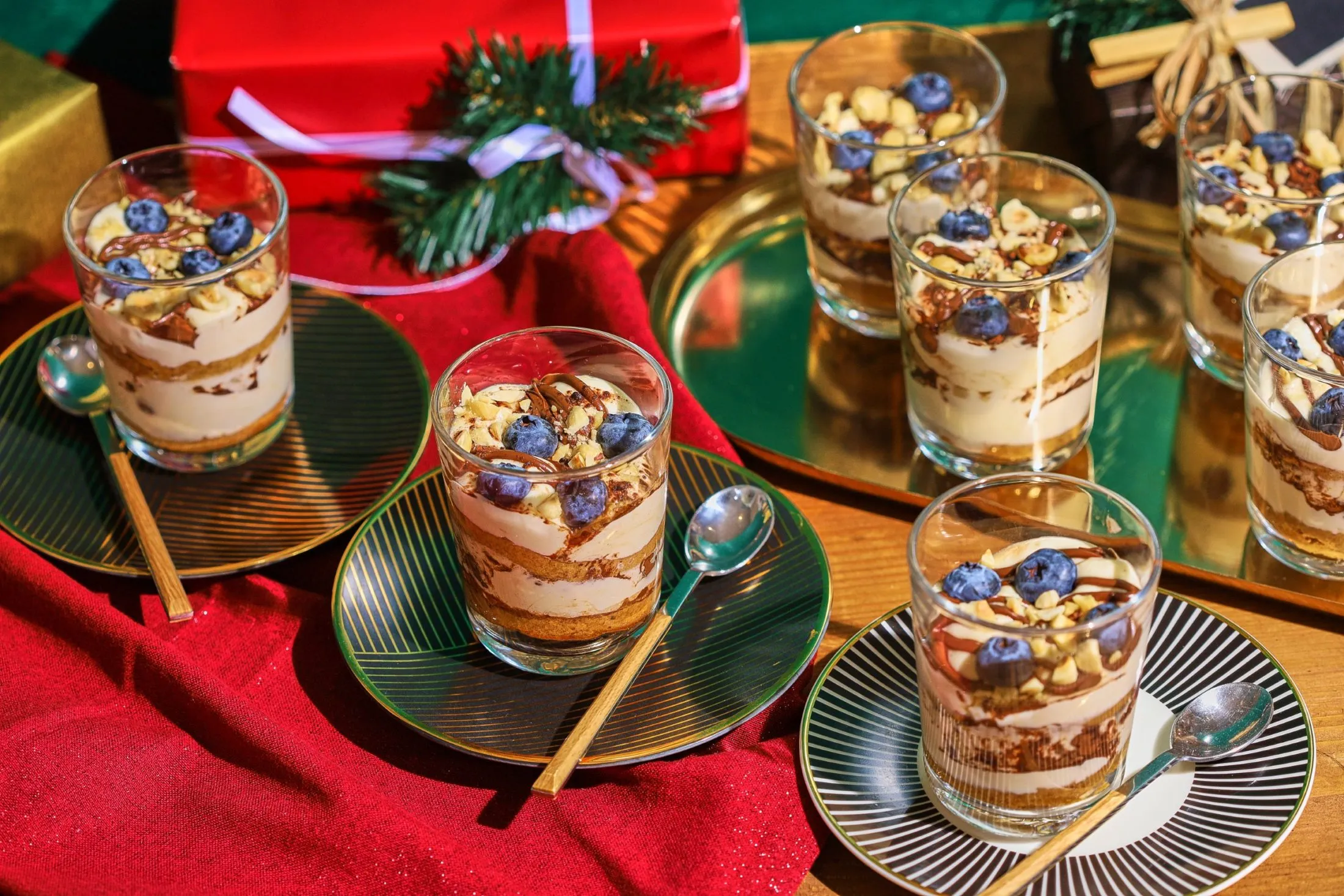 A rétegezéshez alulra tesszük a beáztatott piskótát, aztán jöhet a krém, 7,5 g NUTELLA®, kakaópor és mogyoró, majd újabb réteg beáztatott piskóta, krém, 7,5 g NUTELLA®, kakaópor és mogyoró, végül a tiramisu tetejét néhány szem áfonyával díszítjük.