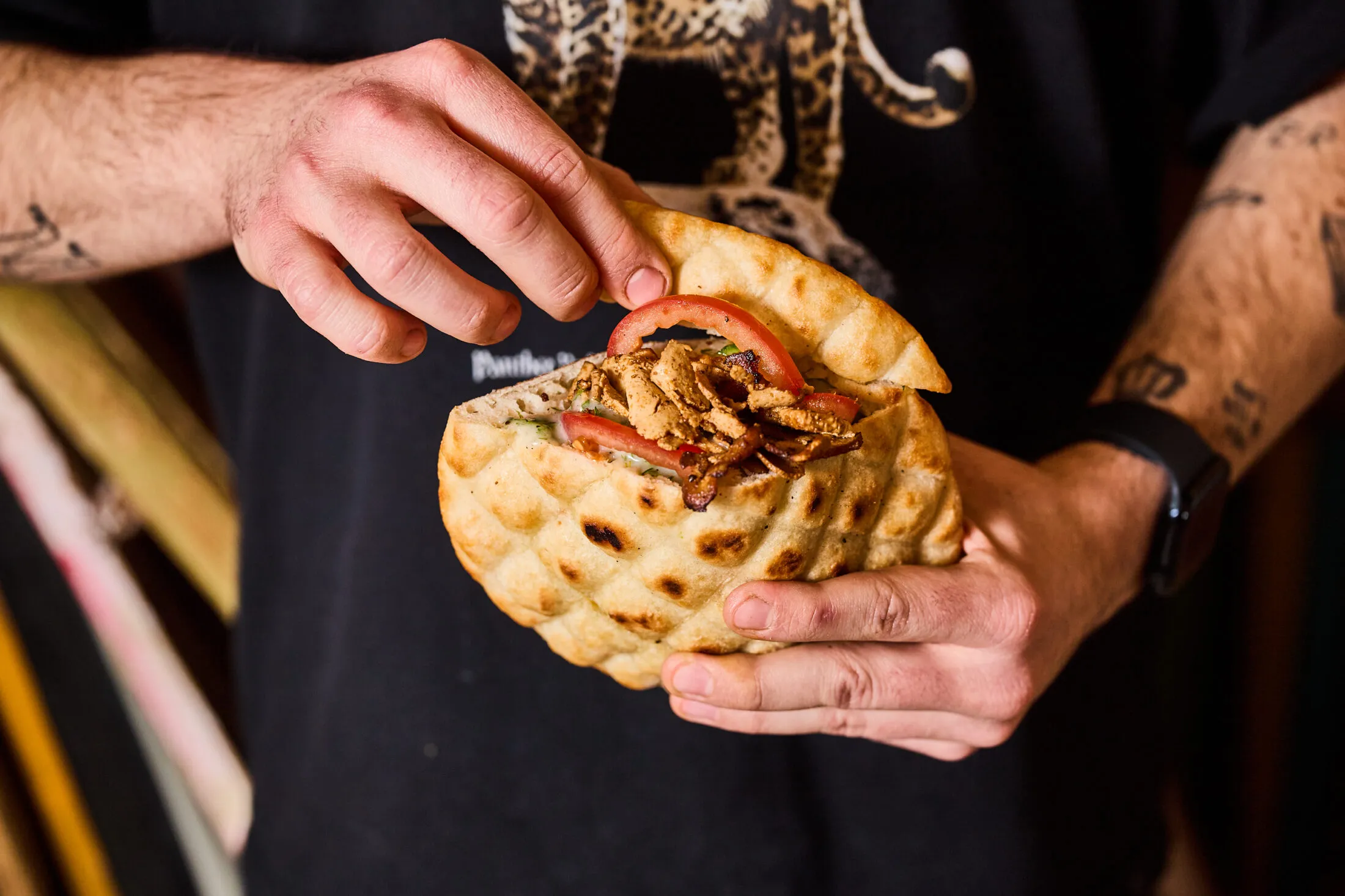 Nincs más hátra, mint a döner összeállítása! A pita tetejét levágjuk, óvatosan egy kis zsebet alakítunk ki benne és kedvünk szerint megpakoljuk sült tofuval, zöldségekkel és persze egy jó adag öntettel.