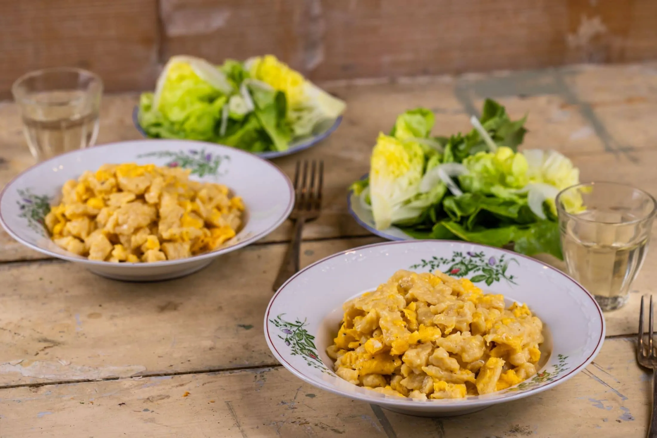 A befejezéshez a tojásokat egy tálba ütjük, sózzuk, borsozzuk és felverjük. Egy serpenyőt közepesen felforrósítunk, beledobjuk a vajat, és amikor megolvadt, ráöntjük a tojást. Fél percig hagyjuk sülni anélkül, hogy megkevernénk, utána rádobjuk a galuskát, és ekkor egyszer átkeverjük. Hagyjuk 10 másodpercig sülni, majd megint átforgatjuk kicsit. Épp csak addig sütjük-kevergetjük, míg a tojás összeáll, utána rögtön tálaljuk is, hogy még jó forrón, remegősen kerüljön az asztalra. Az utolsó pillanatban a salátákat is megfürösztjük a lében, a tetejükre pakolunk keveset a hagymákból és így rakjuk a tojásos galuska mellé.