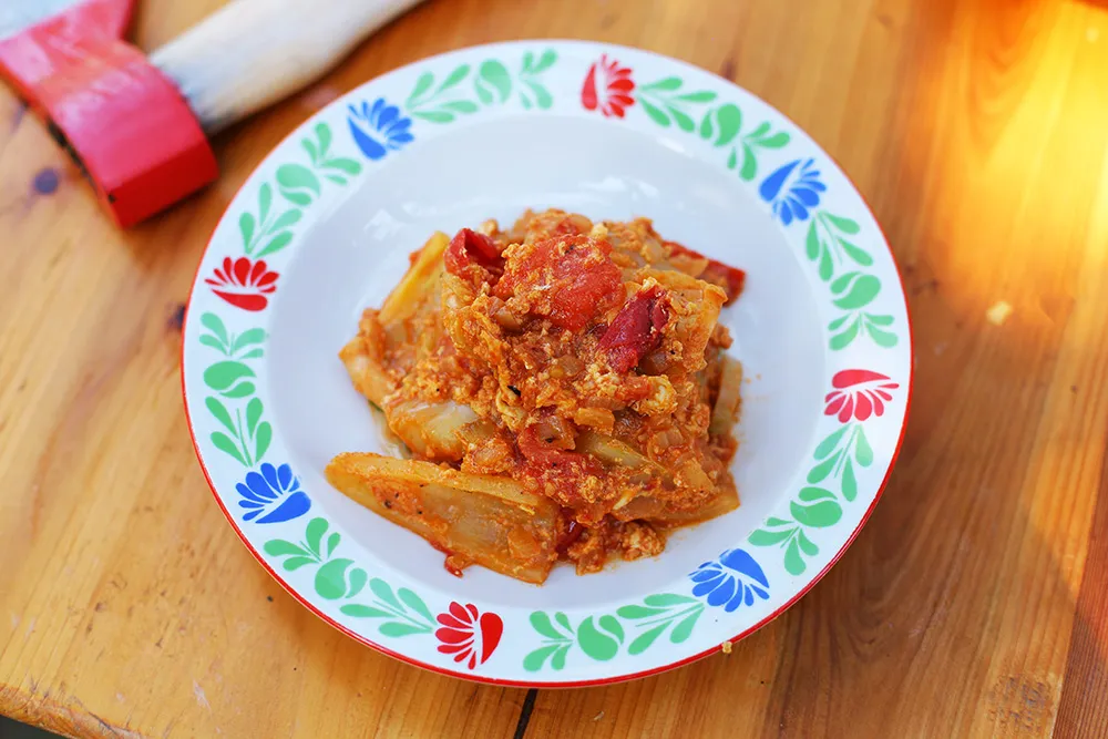 A tojásos lecsó elkészítéséhez olajat hevítünk a bográcsban, majd erre dobjuk a felaprított hagymát. A paprikát nagyobb darabokra vágjuk és alaposan pirítani kezdjük. Mehet mellé a felkockázott paradicsom, és elkezdjük beízesíteni: érkezik a só, a bors, a szárított majoranna és persze a felszeletelt fokhagymagerezdek is. Hagyjuk még 10 percig párolódni a zöldségeket, majd hozzáadjuk a fűszerpaprikát. Az enyhén besózott tojásokat felverjük és hozzáadjuk a lecsó alaphoz. Még egy kis kevergetés kell, hogy a tojás összeálljon és már kész is van.