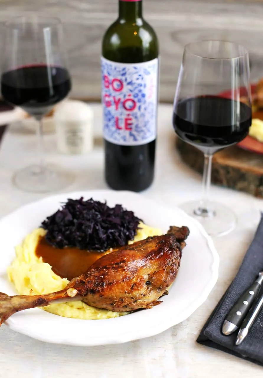 A vöröshagymát vastagabb szeletekre vágjuk és egy nagy tepsibe szórjuk a fokhagymával és a babérlevéllel együtt. A megtisztított libacombokat, sózzuk, borsozzuk, fűszerezzük és bőrös felükkel fölfelé a hagymaágyra helyezzük, ahol szintén megsózzuk és megborsozzuk. A combok mellé öntjük a vizet, lefedjük alufóliával és kb. 4 órára 150 fokos sütőbe tesszük. A párolt káposztához egy lábast felmelegítünk és a cukrot karamellizáljuk, öntünk hozzá kevés olajat, majd a vékonyra szeletelt vöröshagymát jól átforgatjuk rajta. A szintén vékony szeletekre vágott káposztát is hozzáadjuk, megszórjuk őrölt köménnyel, sóval és pirítani kezdjük. Egy másik lábasban egy kevés olajat hevítünk és a libanyakat és -szárnyat jól körbepirítjuk majd félretesszük. Jöhet a feldarabolt sárgarépa, fehérrépa, zeller, vöröshagyma és a fokhagyma is, amiket szintén jól megpirítunk majd visszatesszük melléjük a libalakatrészeket. Hozzáöntjük a vörösbort és a vizet.