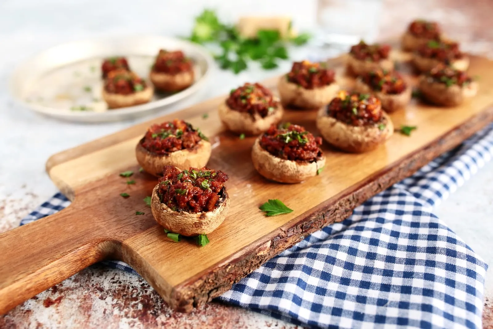 Mehet hozzá a sűrített paradicsom és a fűszerek. Ha túl sűrűnek találnák a tölteléket, pici vízzel hígíthatjuk. A végén hozzászórjuk a parmezánt, átkeverjük és egy kiskanál segítségével belepakolásszuk a gombafejekbe. Adunk még mindegyiknek egy csipetnyi reszelt parmezánt és megszórjuk őket vágott petrezselyemmel. 175 fokos sütőben 18-20 perc alatt készre sütjük.