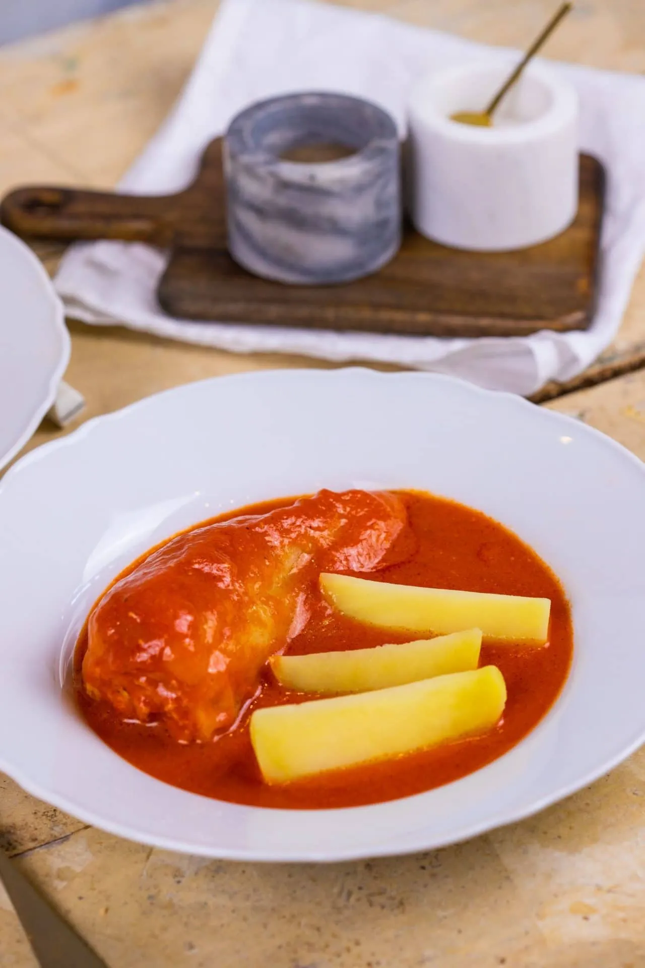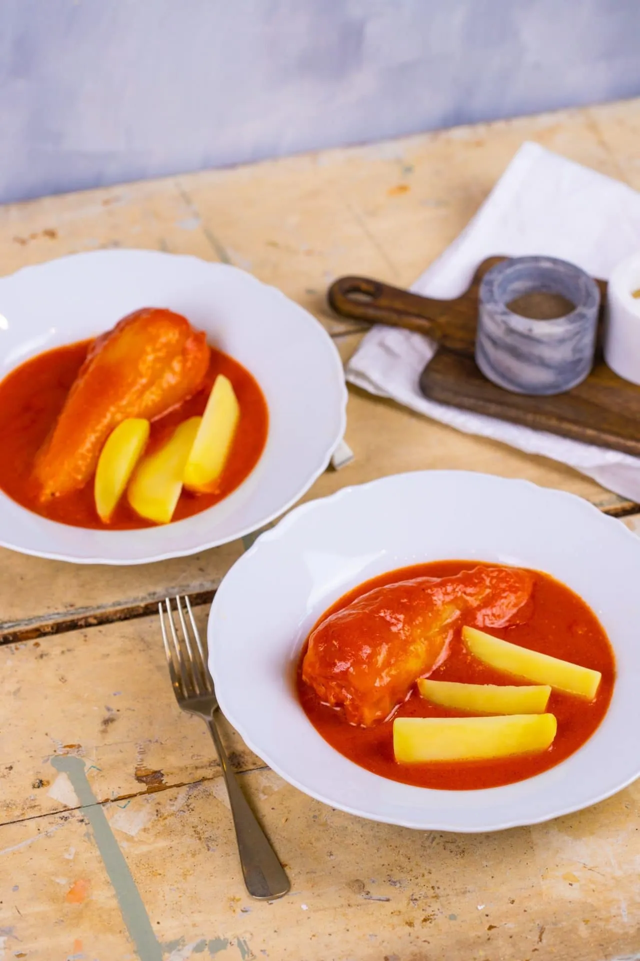 Fedő alatt, kis lángon 45 percig főzzük, amíg megpuhulnak a paprikák és a töltelék is tökéletesen elkészül. Kihalásszuk a zellereket, a keményítőt kikeverjük 100 ml hideg vízzel, és a mártásba öntjük. Óvatosan összerázogatjuk az egészet, és további 5 percig főzzük kis lángon. Megkóstoljuk a mártást, ha kellőképpen édeskés-sós-paradicsomos, akkor félretesszük, és hagyjuk 15 percig pihenni. Köretként cikkekre vágott, jó sós vízben főtt burgonyát adunk hozzá.