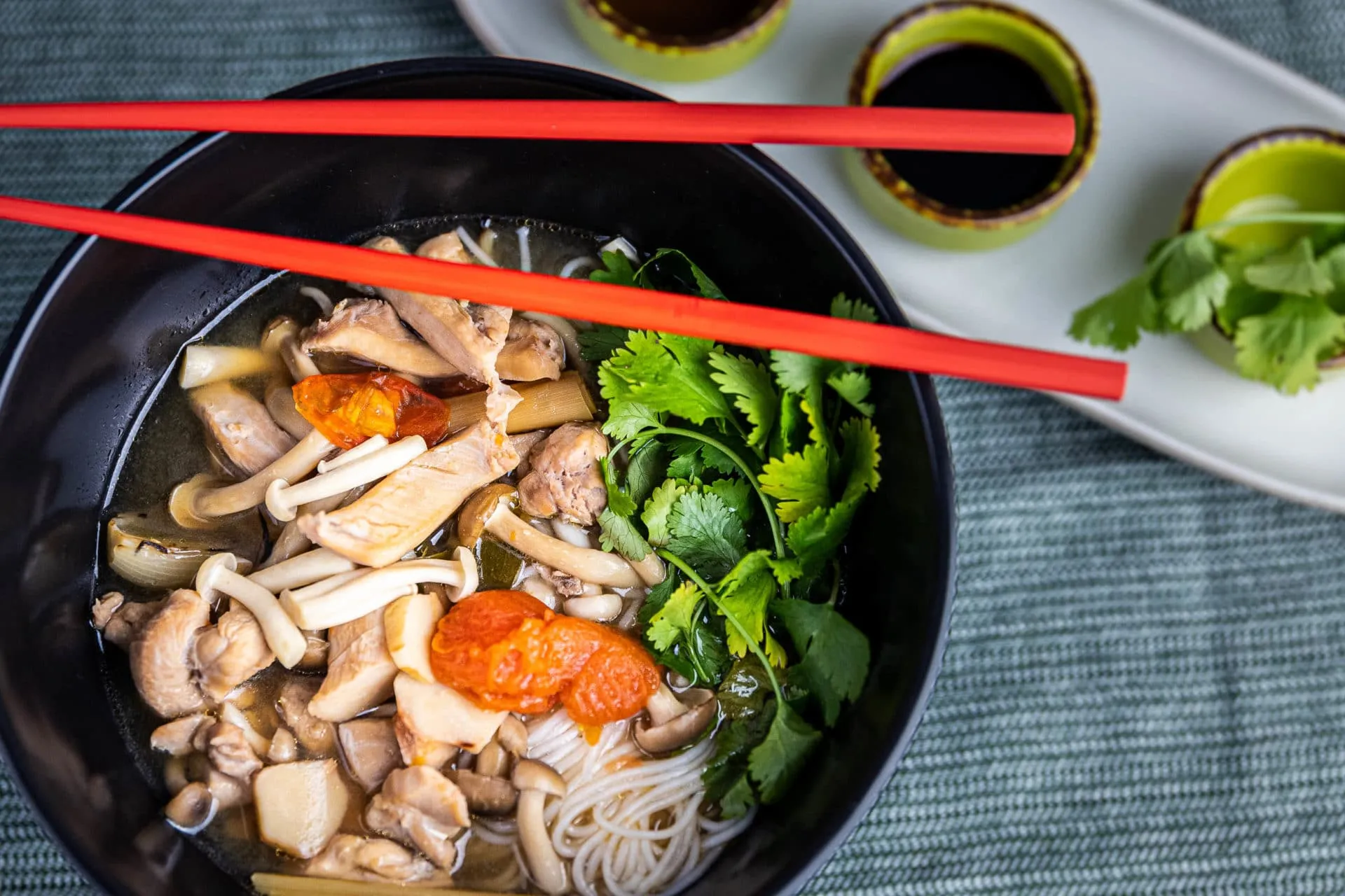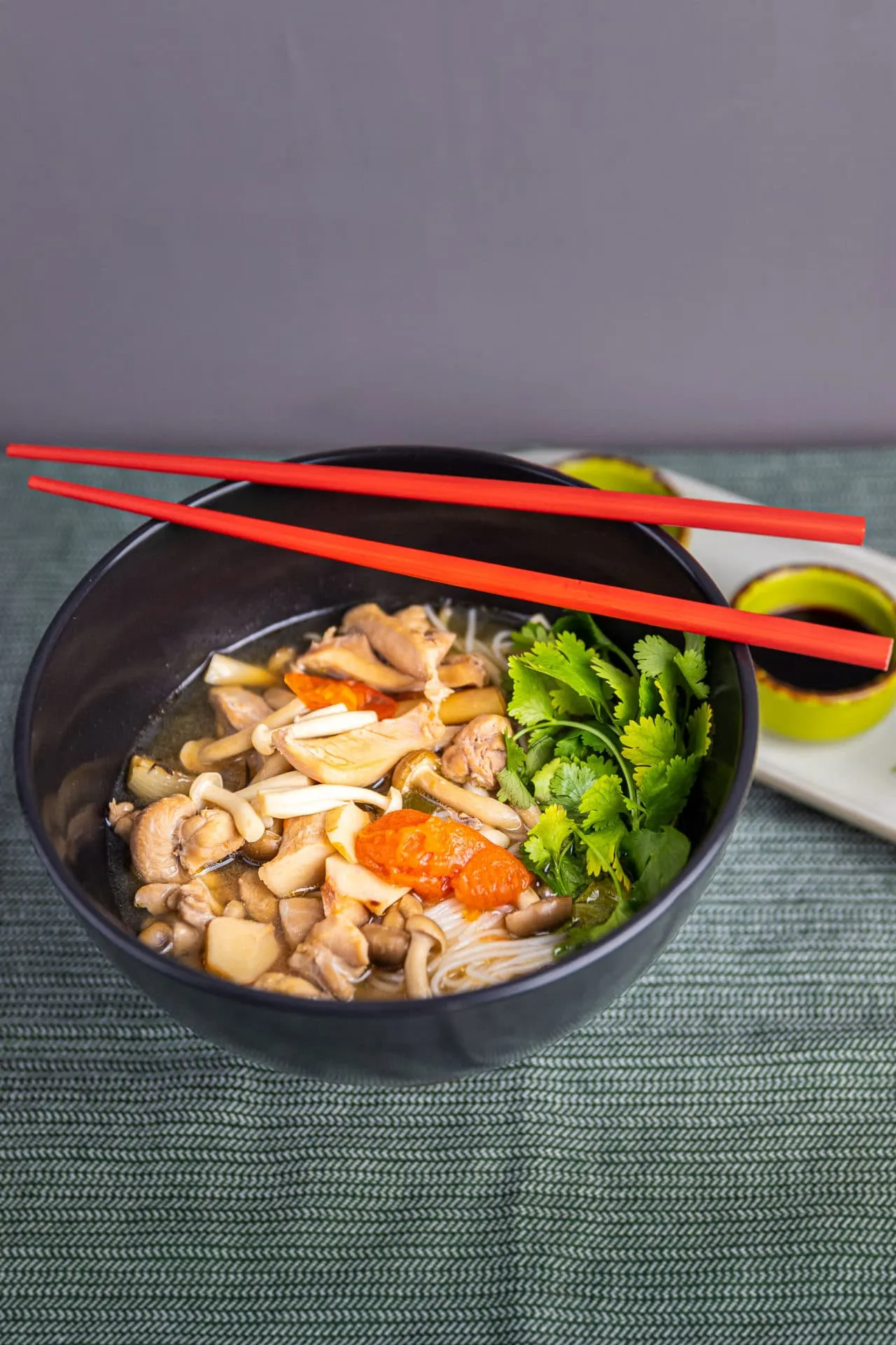 Amikor 15 perc főzésnél tartunk, a levesbe helyezzük a félbevágott koktélparadicsomokat, rá 3 percre a gombákat. Beleöntjük a lime-levet, rottyantunk rajta egyet, megkóstoljuk, ízlés szerint még ízesíthetjük, aztán tűzforrón, rizstésztával és friss korianderrel tálaljuk.
