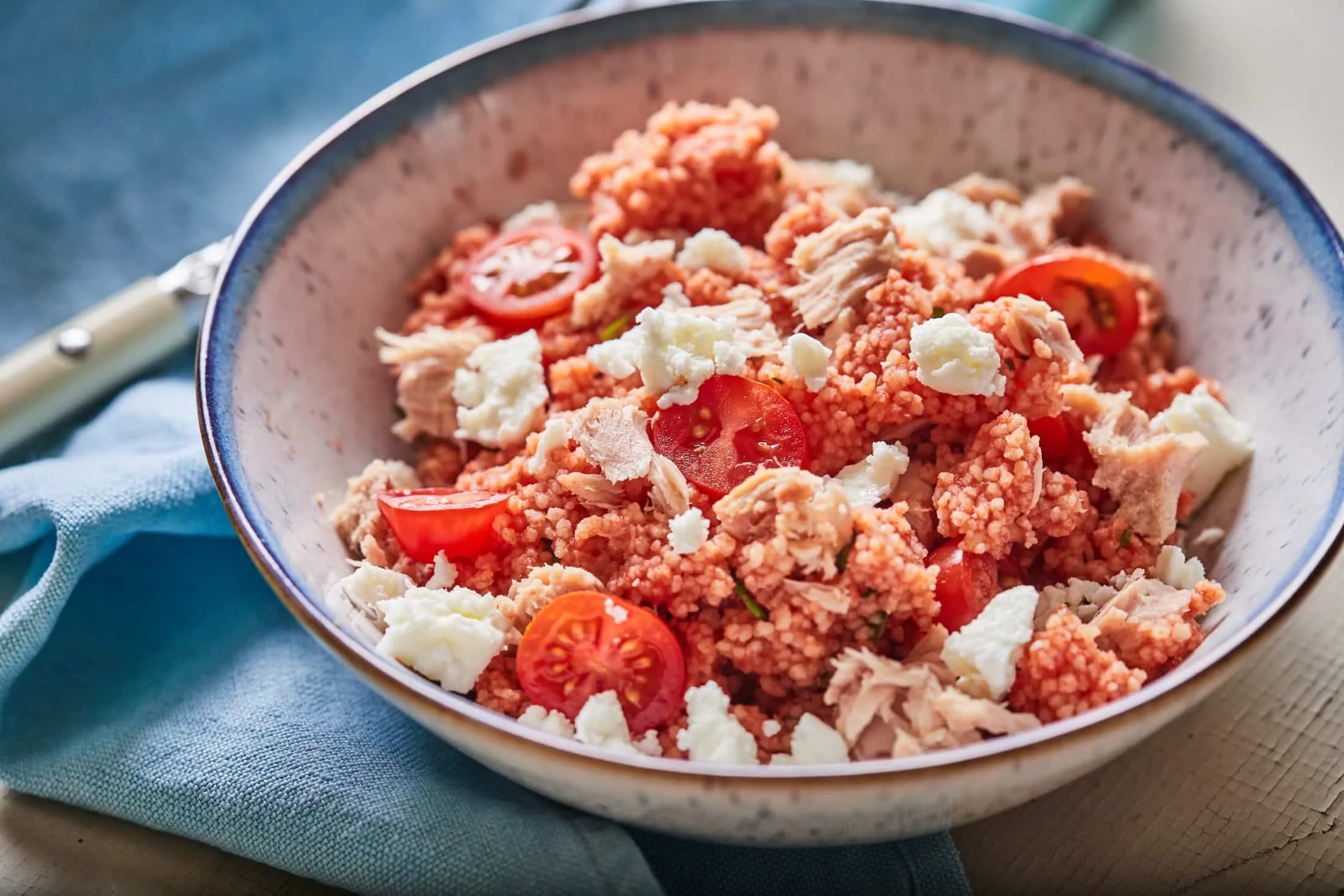 A paradicsomos kuszkusz elkészítéséhez a kuszkuszt egy tálba tesszük, elkeverjük benne a sót, majd felöntjük a forrásban lévő vízzel, és lefedjük. Amíg a kuszkusz magába szívja a vizet, elkészítjük a paradicsomszószt. A serpenyőt felforrósítjuk, majd beleöntjük a passatát. Ízesítjük cukorral és sóval, majd forrástól számítva 1 perc után lehúzzuk a tűzről, és összekeverjük a kuszkusszal. A paradicsomot apró kockákra vágjuk, majd belekeverjük a kuszkuszba a finomra vágott petrezselyemmel, a tépkedett tonhallal és a morzsolt feta sajttal együtt, és már tálalhatunk is.