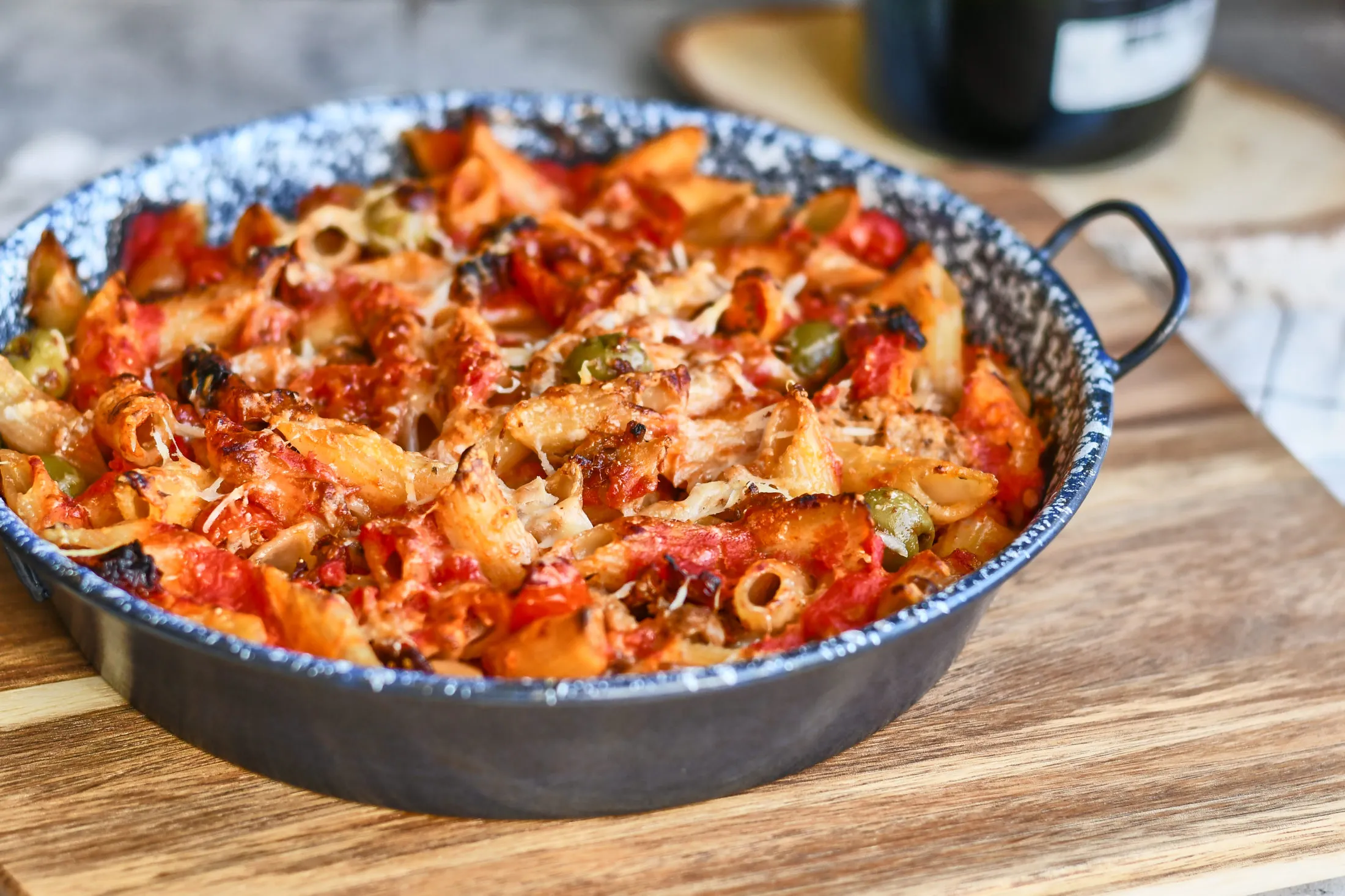 A pennét bő, sós, forró vízben elkezdjük főzni. Közben az olajon lepirítjuk az apróra vágott hagymát és fokhagymát, majd felöntjük a borral, és pár percig még forraljuk. Beledobjuk a konzerv paradicsomot, hozzáadjuk a fűszereket, és még pár percig főzzük. Belekeverjük a tonhalkonzervet, az olajbogyókat, a vékony csíkokra vágott aszalt paradicsomot, a reszelt parmezánt és az al dentére főtt tésztát. Egy Hőálló tálba rakjuk a pennét, esetleg reszelünk még rá kevés parmezánt, és 180 fokra előmelegített sütőbe tolva 25 percig sütjük.