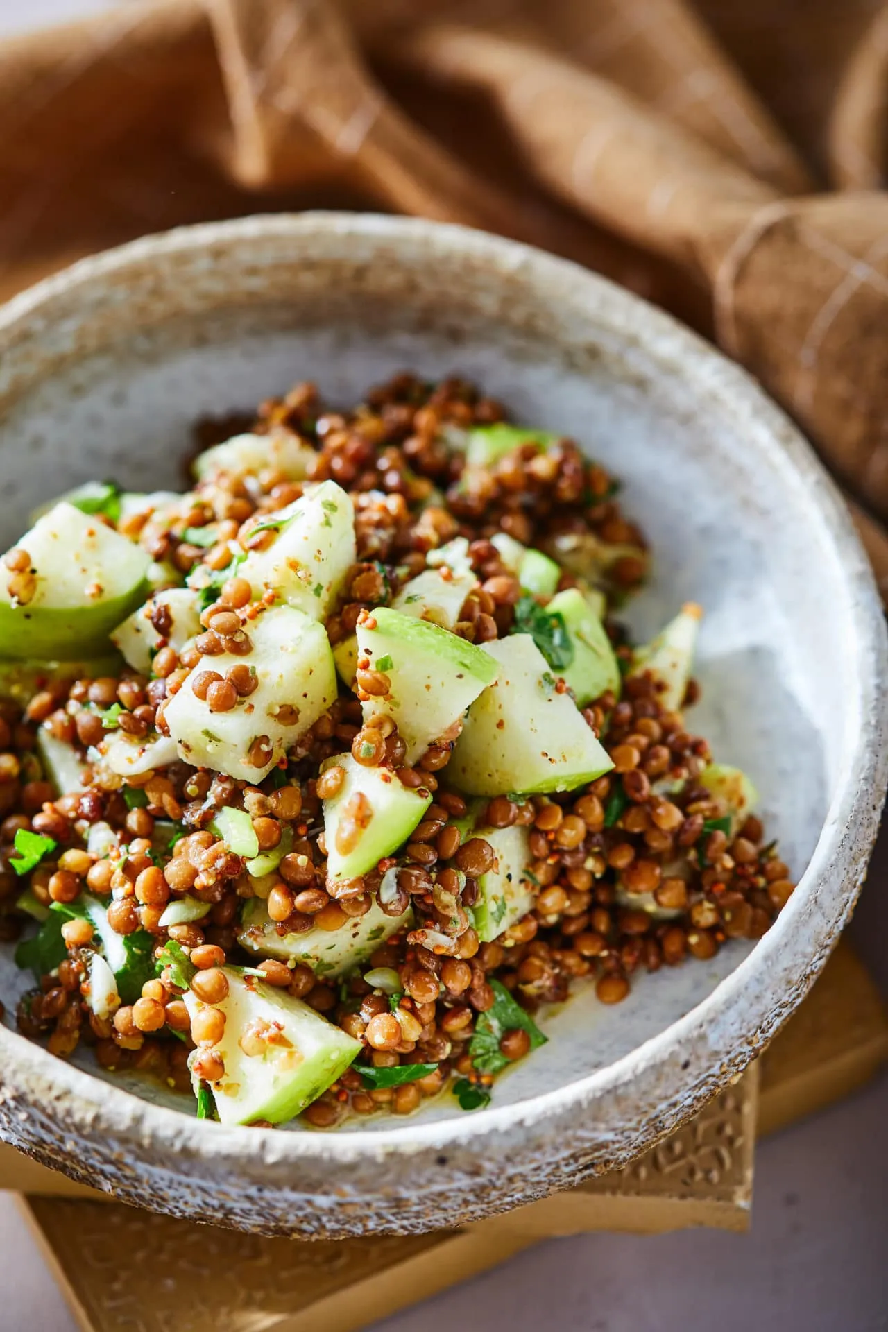 A lencsét leszűrjük és átmossuk. Hozzákeverjük az aprított újhagymát, a felkockázott zöld almát, az olívaolajat, a tormát, a magos mustárt, a szárított tárkonyt, és ízlés szerint sózzuk, borsozzuk.