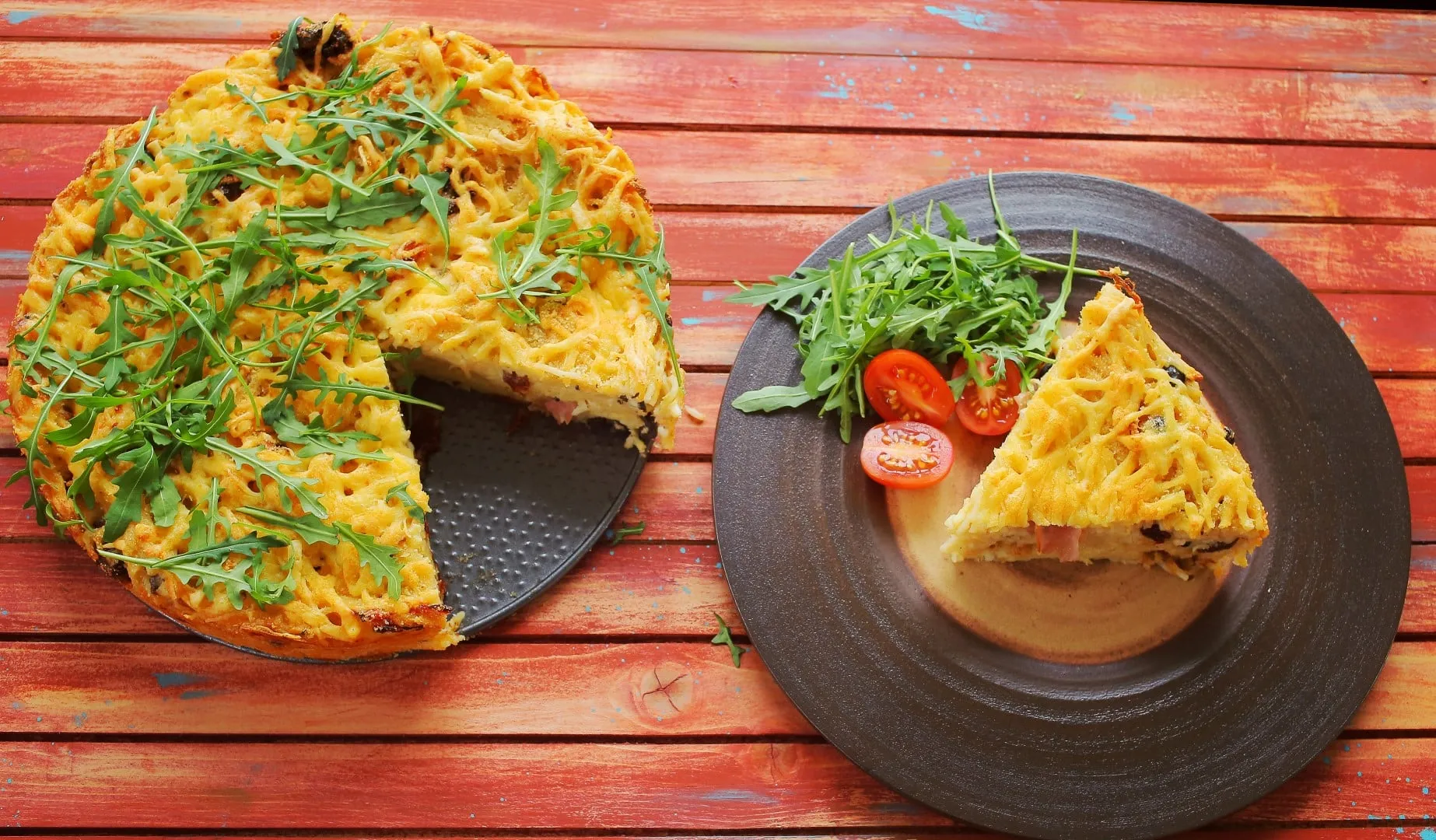 Hozzáadjuk a reszelt sajtot, az apróbb darabokra vágott szárított paradicsomot, az olajbogyót és a sonkát, majd az egészet alaposan összeforgatjuk és egy kivajazott, zsemlemorzsával meghintett tortaformába öntjük. A tetejét megszórjuk reszelt sajttal és egy kevés morzsával, majd 180 fokos sütőben 20-25 perc alatt készresütjük.