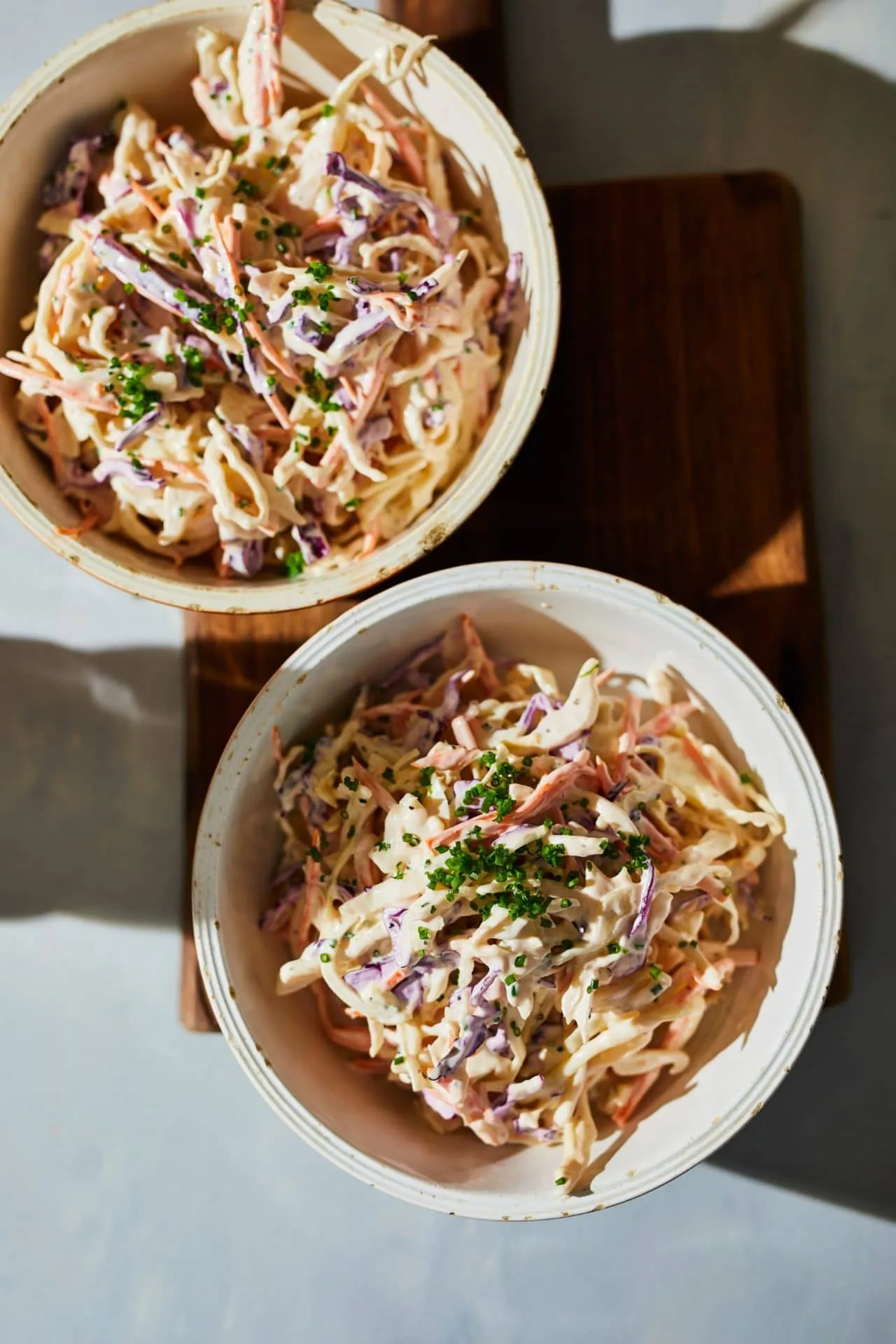 A káposztákat és a répát vékony csíkokra vágjuk, a hagymát pedig hajszálvékony szeletekre. A tejfölt, a majonézt, a dijoni mustárt, a fehérborecetet és az apróra vágott snidlinget összekeverjük, majd belekeverjük a zöldségeket. Borsozzuk, viszont sózni csak fogyasztás előtt kell, mert ha előre sózzuk, levet enged a zöldség.