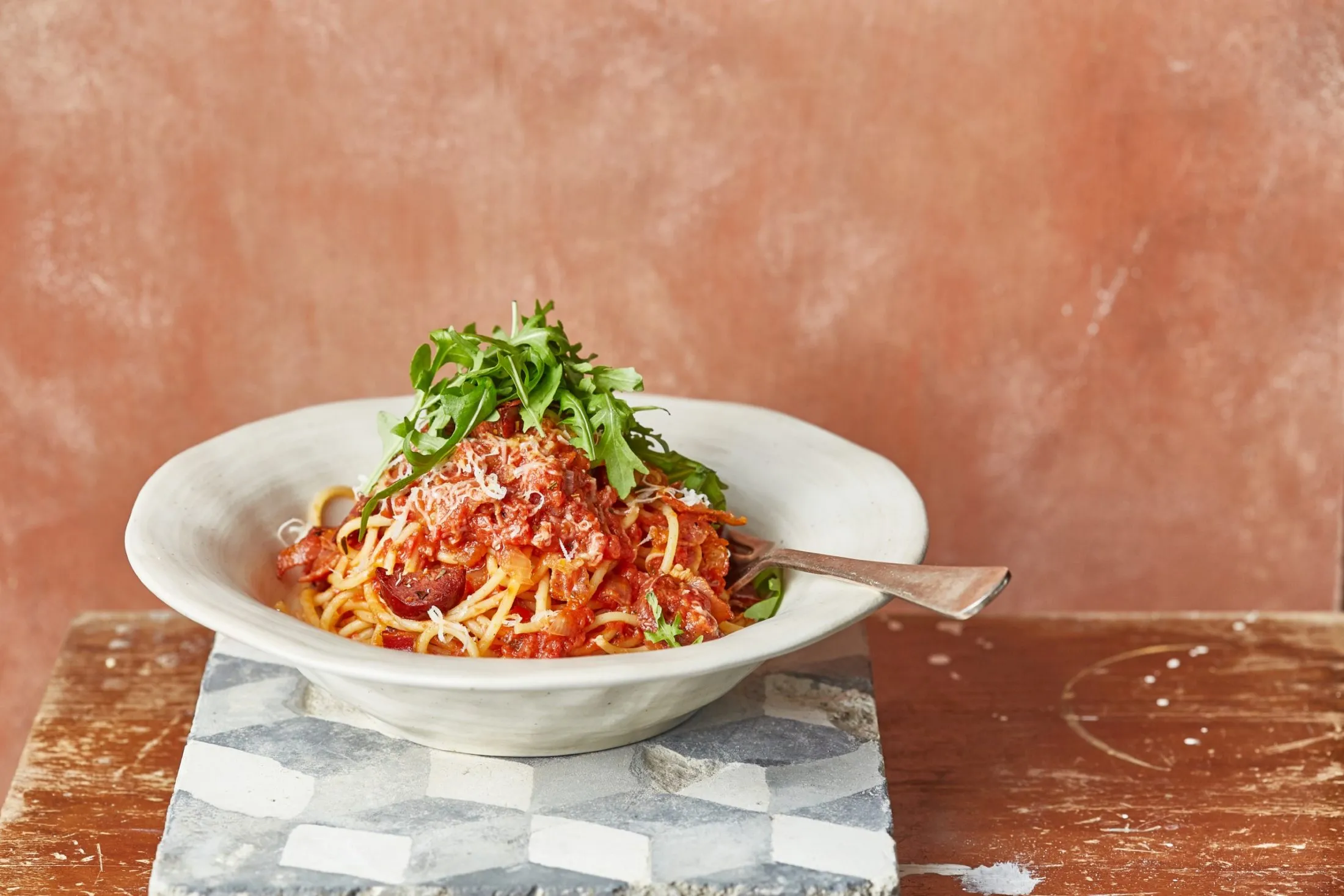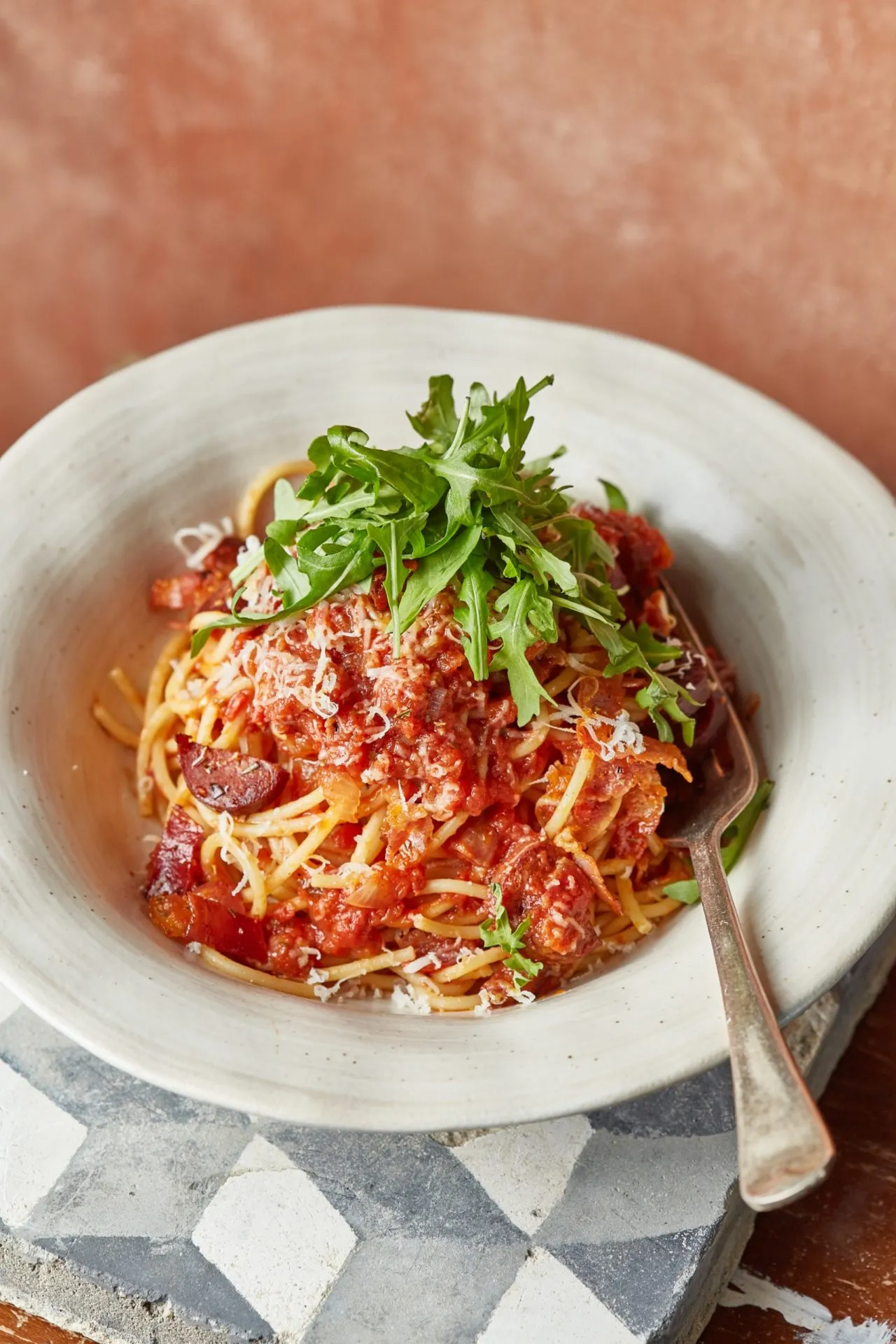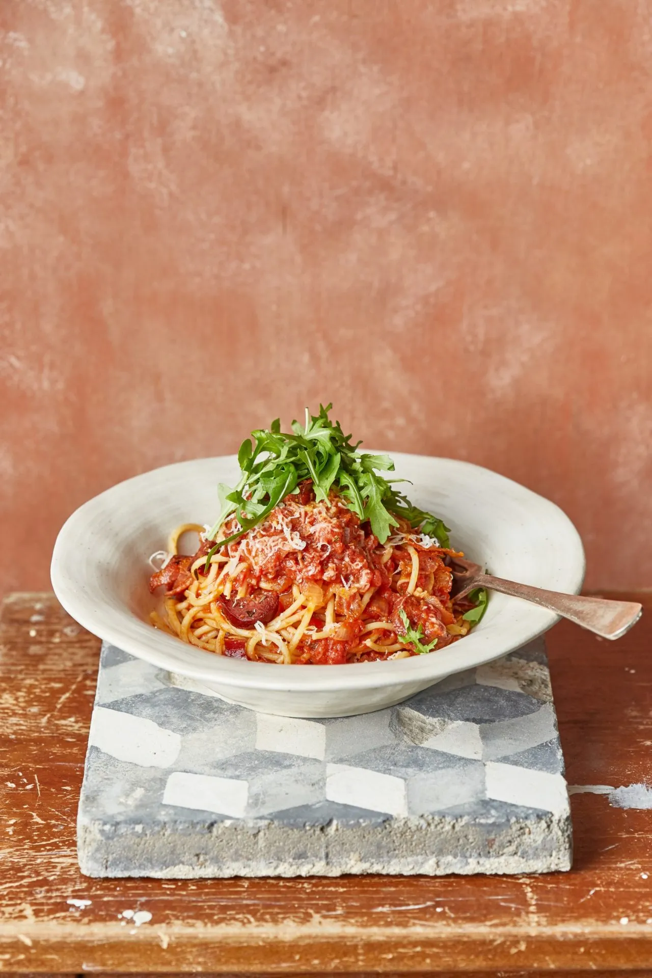 A kolbászt, a sonkát és a bacont felszeleteljük, megpirítjuk, majd rárakjuk a felszeletelt fokhagymát és az apróra vágott hagymát, sózzuk, borsozzuk, és üvegesre pároljuk. Ezután felöntjük a darabolt paradicsommal, vízzel, balzsamecettel. 10 percig rotyogtatjuk, a végén belereszeljük a parmezánt. A tésztával tálaljuk.
