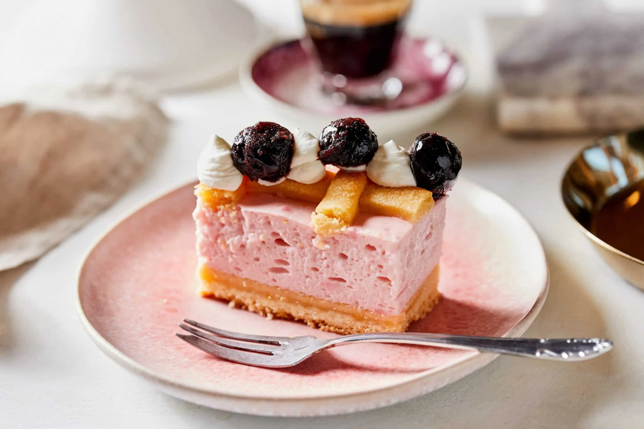 Díszítésként a tejszínt a porcukorral kemény habbá verjük, majd egy habzsák segítségével tetszőleges pöttyöket nyomunk a sütemény tetejére, és a törlőpapíron leitatott meggyszemekkel díszítjük. Végül kis szeletekre vágjuk, érdemes hullámos élű késsel, mert a tészta a tetején nagyon omlós és törékeny.