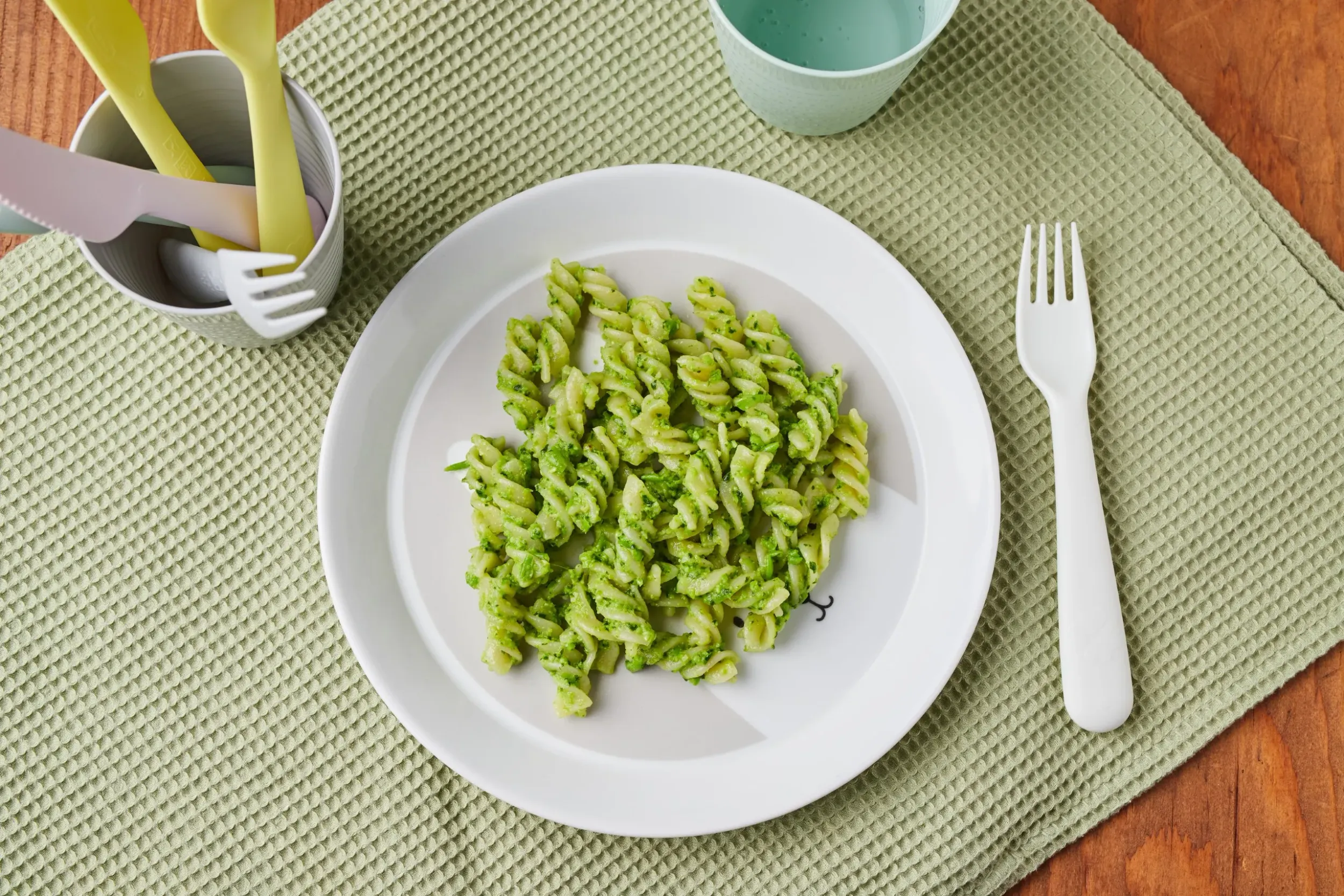 TIPP: A babáknak a tésztát ne al dentére főzzük, hanem mindenképpen kicsit készítsük túl. A fusilli tészta formája éppen ideális, megtartja a szószt, mégis könnyen, kézzel ehető. Villát 2 éves életkor alatt nem feltétlen szükséges használni, a gyermek kezének anatómiája miatt általában erre még nem képesek. Hagyjuk őket ezért a darabos ételeket kézzel enni, így megfelelő tapasztalatokat szerezhetnek (szenzoros ingerek) és ügyesedhetnek (finommotorika). Ne törölgessük a (zöld pesztós) száját étkezés közben, főleg ne popsitörlővel (undort, öklendezést válthat ki, próbáljuk csak ki saját magunkon, milyen érzés).