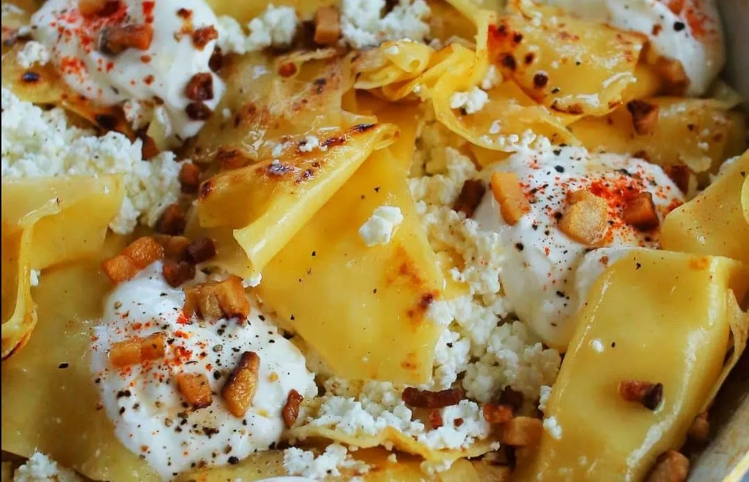 A túrós csusza elkészítéséhez a szeletekre vágott fokhagymát kevés sóval péppé zúzzuk egy kés lapjával, és elkeverjük a tejfölben. A szalonnát kis kockákra vágjuk, és egy serpenyőben ropogós pörccé pirítjuk. Félretesszük, a zsírját a serpenyőben hagyjuk. Közben a csuszatésztát a lehető legnagyobb darabokban hagyva sós, lobogó vízben al dentére főzzük. Lecsepegtetjük, és rögtön a még tűzforró serpenyőbe dobjuk. Alaposan lepirítjuk, és az egészet átfordítjuk. Elzárjuk a lángot, a pirult tésztára rákanalazzuk a fokhagymás tejfölt, kicsit összerázzuk, és a tészta tetejére pakoljuk a maradék tejfölt és a szétmorzsolt túrót. Megszórjuk a szalonnapörccel, kevés pirospaprikával, sóval-borssal, és gyorsan tálaljuk is.