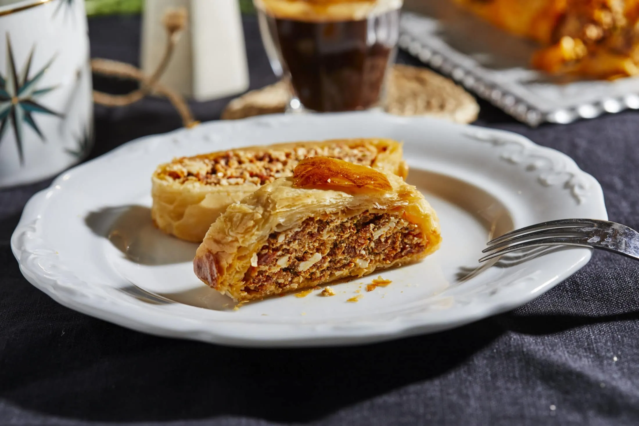 6-6 réteslapot vékonyan megkenünk olvasztott vajjal, és egymásra fektetjük őket egy konyharuhára, hogy majd könnyen fel tudjuk tekerni. A hosszabb oldaluk mentén elosztva a lapokra kanalazzuk a tölteléket, óvatosan feltekerjük, és egy sütőpapírral bélelt tepsire tesszük a két rudat. Tojássárgájával megkenjük a tetejüket, és 180 fokra előmelegített sütőben 25-30 perc alatt aranybarnára sütjük a réteseket.