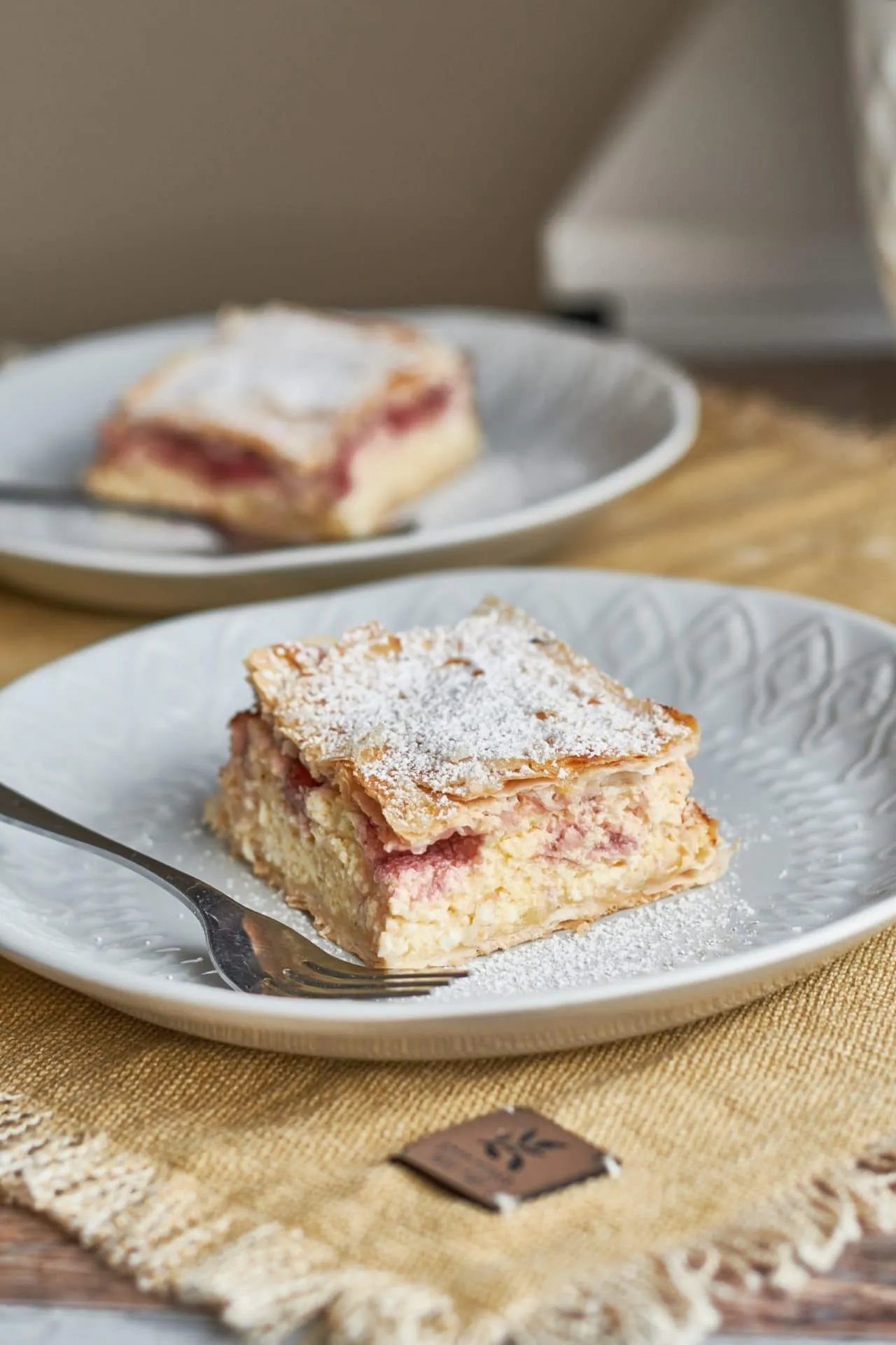 A réteslapokat méretre vágjuk és kétfelé osztjuk. 5-6 réteget lerakunk a forma aljára úgy, hogy mindegyik lapot leheletvékonyan lekenjük tejföllel. A töltelék hozzávalóit alaposan összekeverjük az eper kivételével és a réteslapokra simítjuk. Az epreket megmossuk, kivágjuk a csumáit, 2-3 szeletre vágjuk, majd rásorakoztatjuk a túrórétegre. Erre jöhetnek a maradék réteslapok, mindegyik tejföllel átkenve. A legutolsó lapot lekenjük lazán felvert tojással, megszórjuk a cukorral, és 180 fokra előmelegített sütőbe toljuk, amíg aranybarnára sül.
