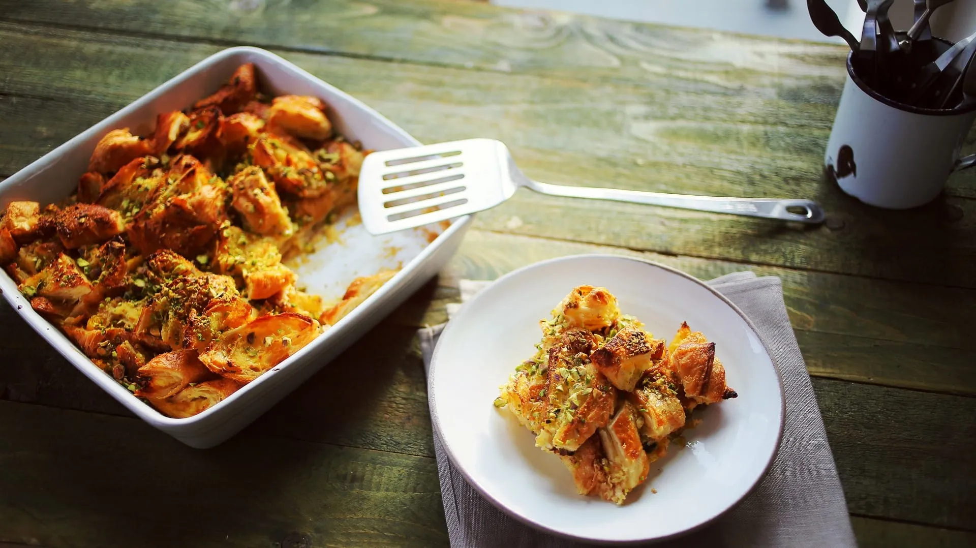 A narancsokat kifilézzük. A túrós táskákat 3-4 cm-es darabokra vágjuk. Egy hőálló tál aljára darabolunk egy kevés hideg vajat, beleszórjuk a túrós táska darabok felét. Rászórjuk a narancsgerezdeket, majd a maradék túrós táskát és a durvára vágott pirított pisztácia felét. A végén az egészet leöntjük a fűszeres tojásos tejjel. A tetejét megszórjuk a maradék pisztáciával.
