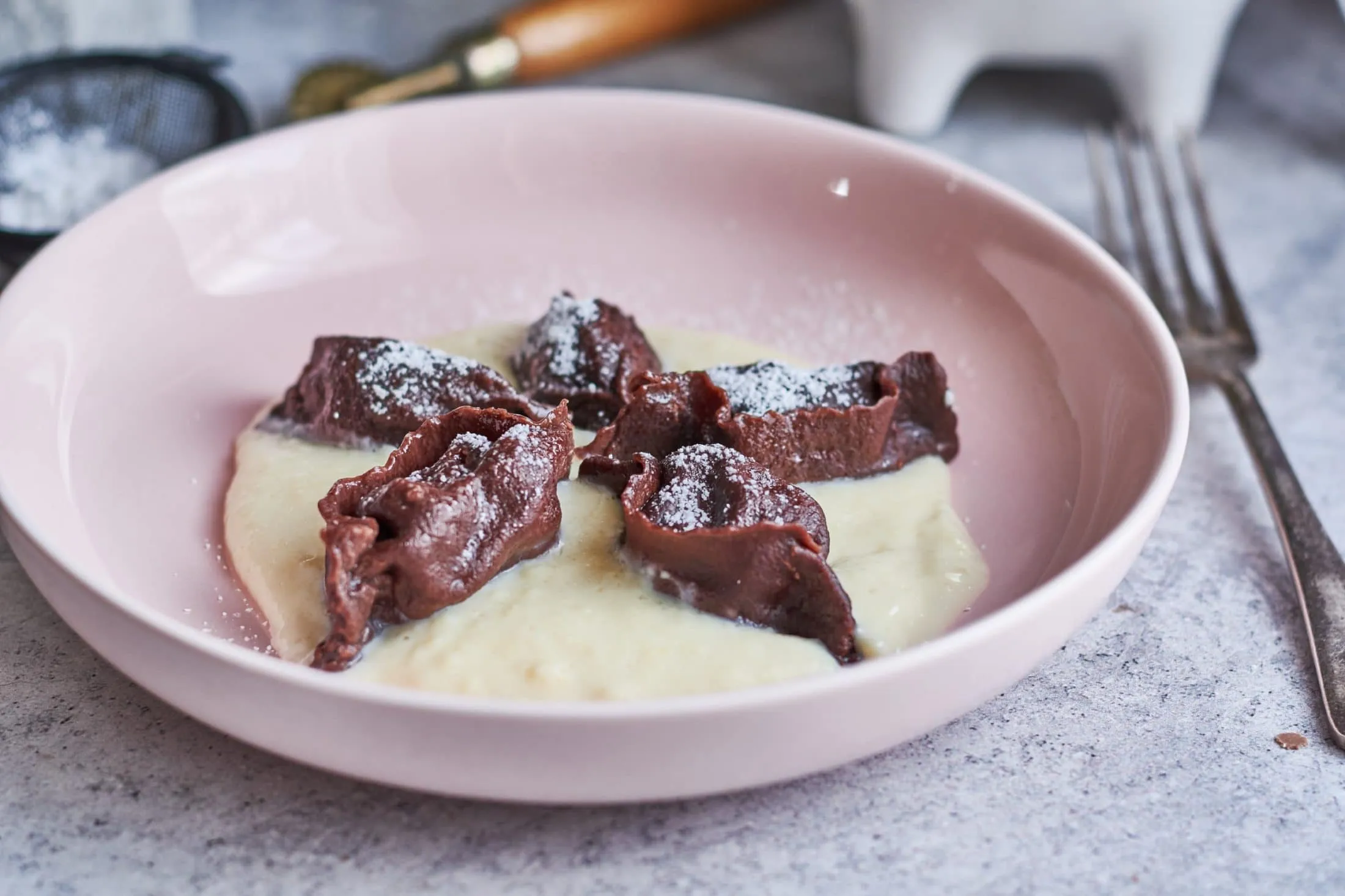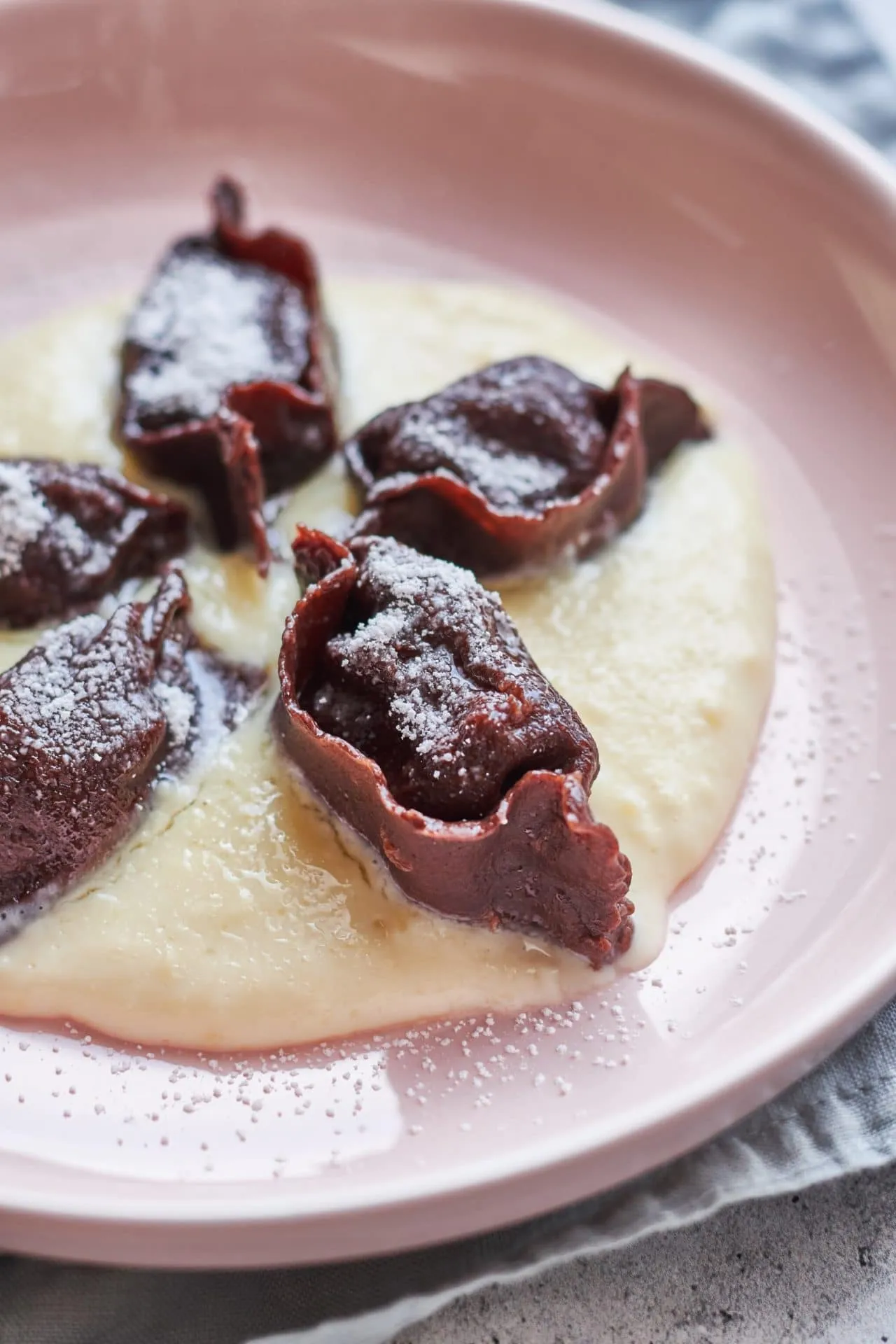 A tésztát tésztagéppel vékonyra nyújtjuk. A kinyújtott tésztasávot kb. 10 cm szélességű sávokra vágjuk. Hosszanti irányban, egymástól kb. egy ujjnyi távolságra kis gombócokat rakunk a tészta szélére a töltelékből, majd egyet hajtunk rajta felfelé, és összecsípjük a középső részeket, ahol helyet hagytunk. A tészta felső részén megmaradó, lelógó részt levágjuk úgy, hogy a tésztánál hagyunk kb. 2 cm-t. Ezeket is hozzácsípjük a tésztához, majd derelyevágóval elvágjuk az összecsípett részeknél a tésztát. Forró, sós vízben kb. 2 perc alatt kifőzzük a tésztát. A kis „batyukat” a sodóval és porcukorral tálaljuk.
