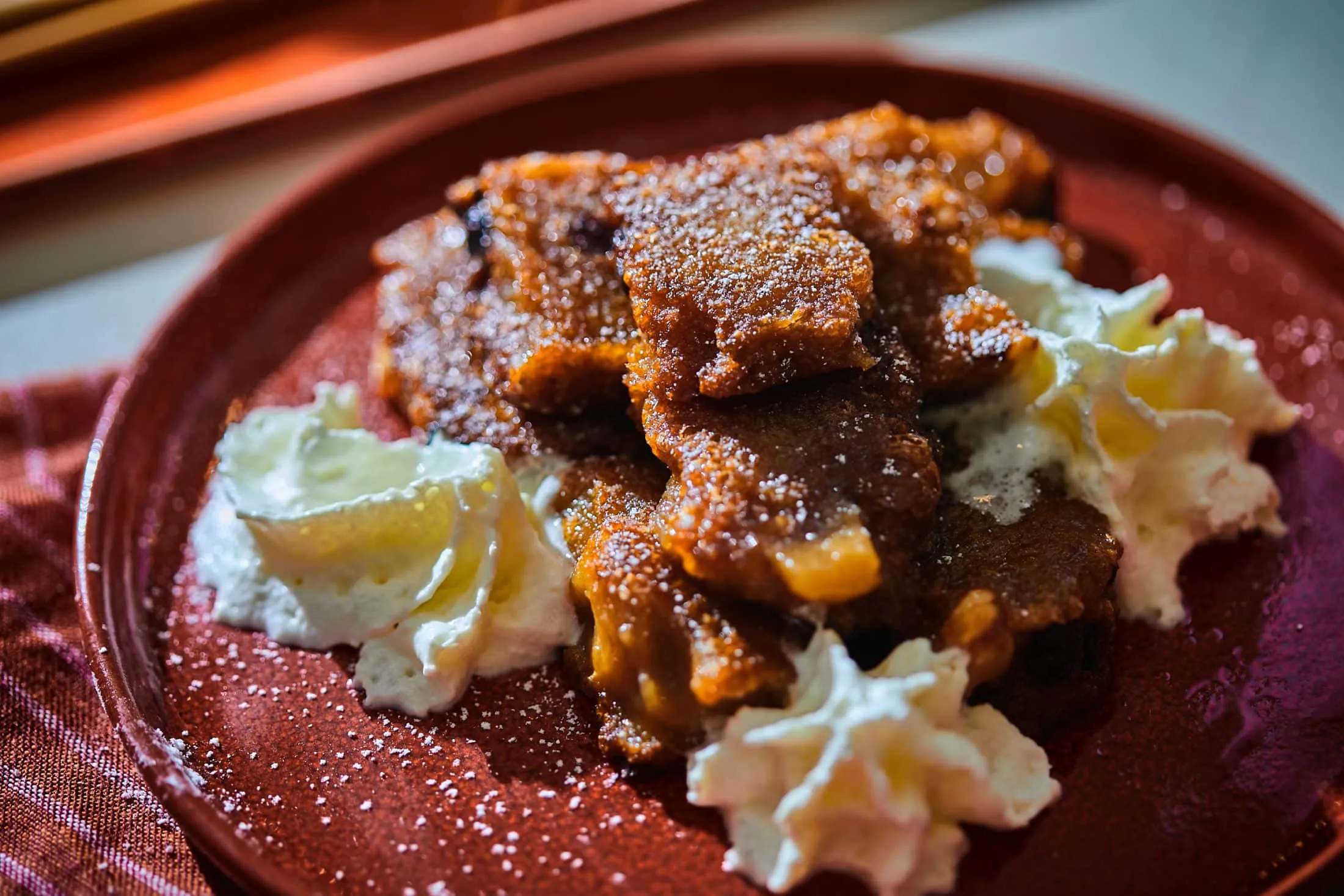 Miután langyosra hűlt, egy késsel körbevágjuk a tortát és kiborítjuk a formából, kb. 1 cm-es szeletekre vágjuk és egy közepesen forró serpenyőben, kevés olajon ropogósra sütjük. Tejszínhabbal tálaljuk.