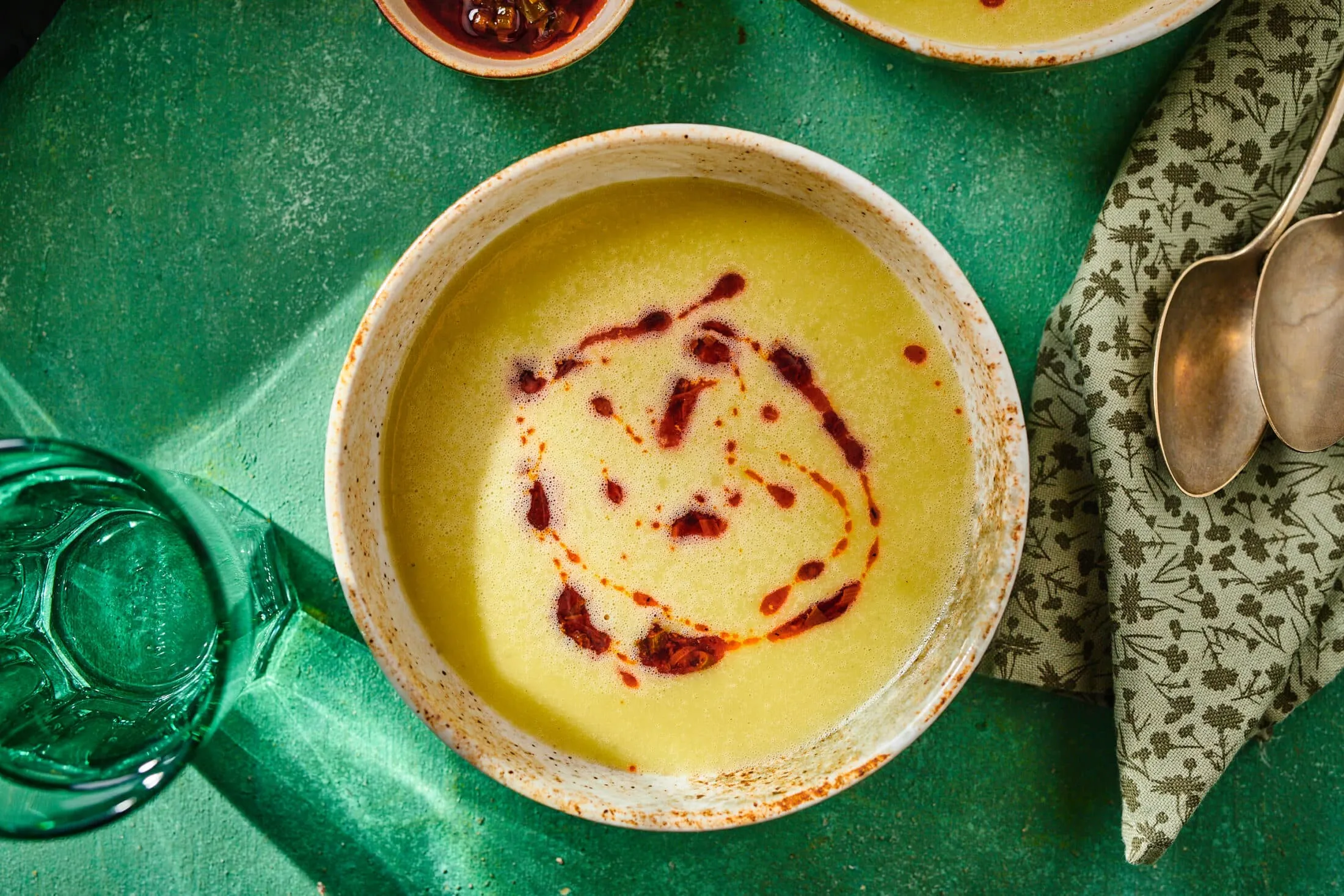 Újhagymás burgonyakrémleves füstölt lazaccal