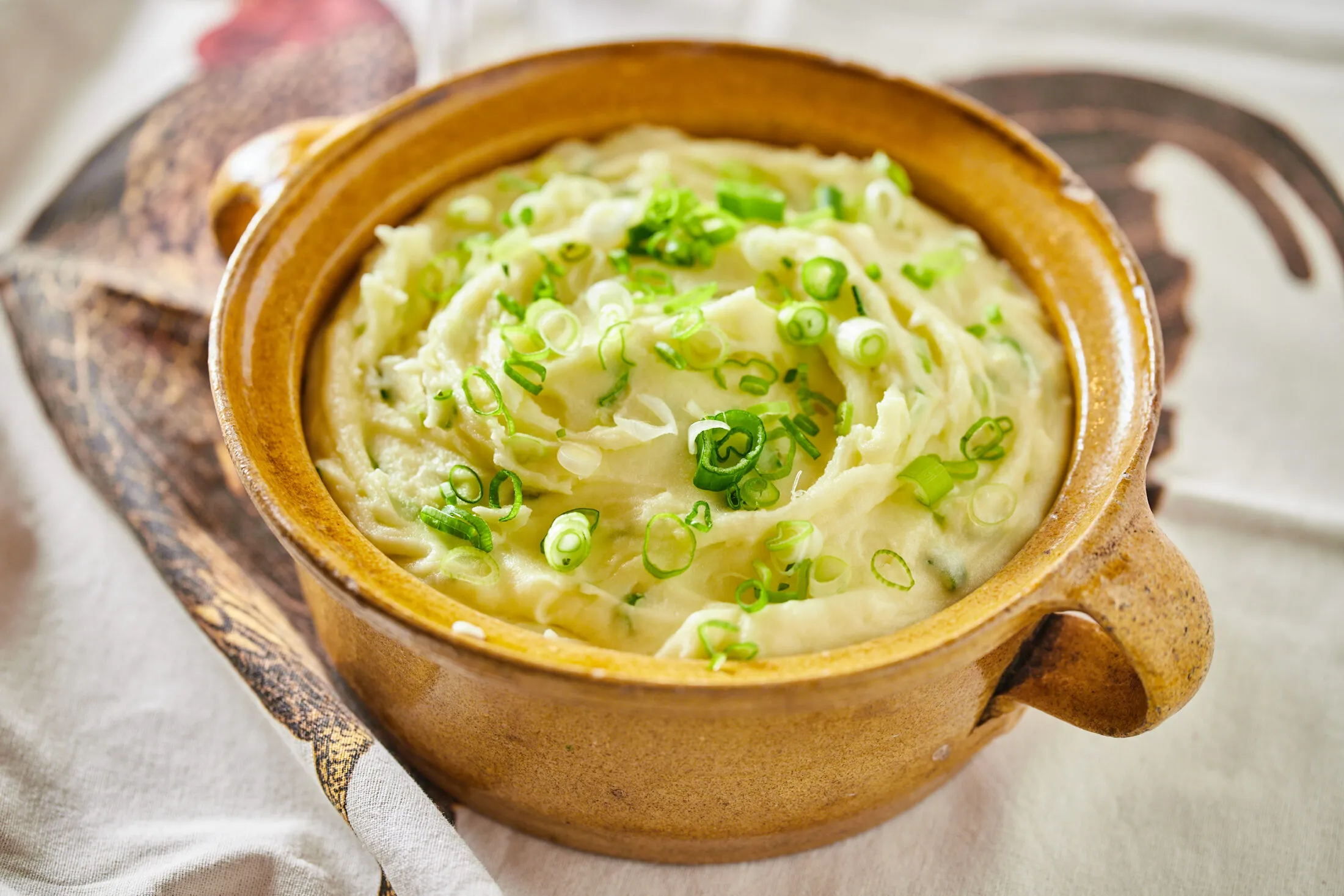 Ha megfőtt a burgonya, leszűrjük, még melegen áttörjük krumplinyomón, és egy habverő segítségével egyből kihabosítjuk a vajjal. (Még véletlenül sem botmixerrel, mert egy ragacsos masszát fogunk kapni, ha szétcsapatjuk benne a keményítőt.) Amikor a burgonya felvette a vajat, akkor beállítjuk a végső állagot a tejjel, ha szükséges, sózzuk, majd hozzákeverjük a vékony karikára vágott újhagymát, és már tálalhatjuk is a kedvenc kabátos húsunk mellé.