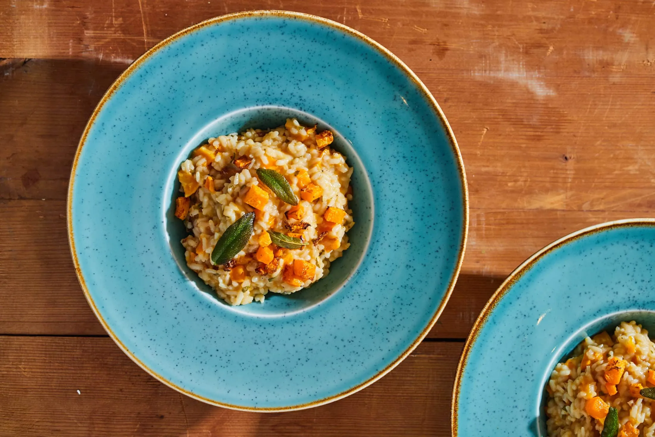 Ha elpárolgott, hozzáadjuk a sütőtök felét, és a klasszikus módon, 2-3 merőkanalanként adagoljuk hozzá az alaplevet. Sózzuk, borsozzuk, majd krémesre főzzük. Ha már sűrű, krémes a rizottó, a rizs pedig al dente, akkor elzárjuk, belerakjuk a maradék vajat és belereszeljük a parmezánt. Belekeverjük a maradék tökkocka nagy részét, majd tálalásnál is szórunk rá belőle és zsályalevelekkel díszítjük.