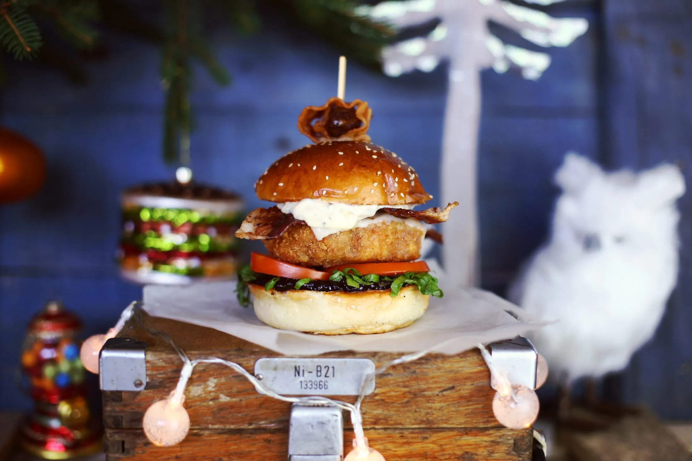 Egy wokban olajat hevítünk, és ha eléri a 170 fokos hőmérsékletet, beletesszük a bepanírozott pulykahús-pogácsát, és aranybarnára sütjük kb. 5-8 perc alatt. Tegyük félre egy papírtörlőre, és pattintsunk rá egy szelet gouda sajtot. Csíkozzunk fel pár levél római salátát, és karikázzuk fel a paradicsomot. A burgert a következőképp szereljük össze: alulra jön a pirított zsömle, ezt gazdagon megkenjünk az áfonyadzsemmel. Erre jön a felszeletelt római saláta, valamint két karika paradicsom, majd a húspogácsa, rajta a sajttal. X-et formázva helyezzük rá a bacont, majd a zsemle tetejét kenjük meg a sült hagymás-zsályás majonézzel, és kész is! A szárított datolyát beletekerjük a harmadik, nem karamellizált baconbe, és a burger tetejére tűzzük díszítésképp.