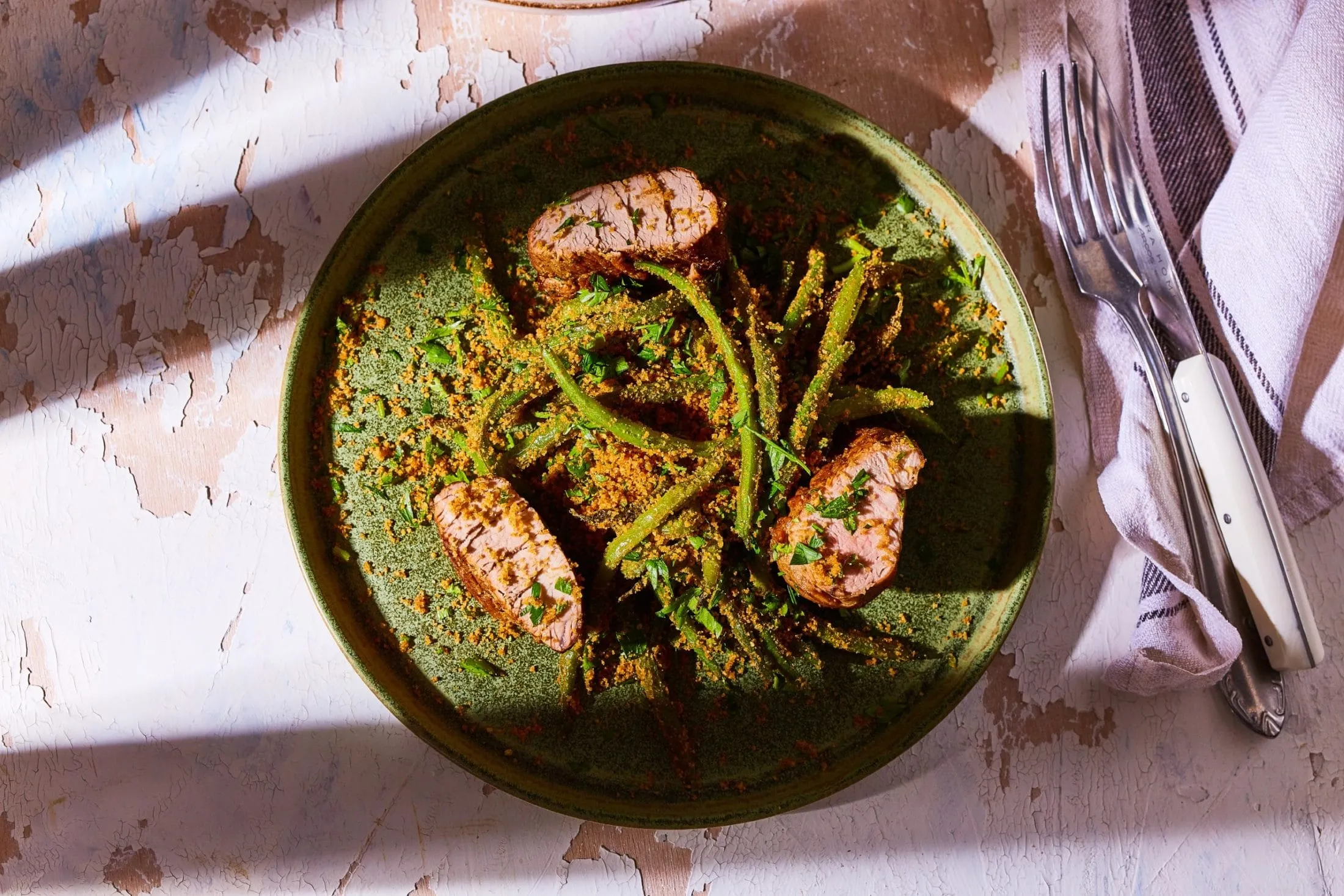 A zöldbabot sós vízben megfőzzük (ügyeljünk rá, hogy ne főzzük túl, 2-3 perc elég is neki), majd hideg víz alatt lehűtjük. A vajat felolvasztjuk egy serpenyőben, átforgatjuk rajta a zöldbabot, és sózzuk, borsozzuk. Egy száraz serpenyőben lepirítjuk a zsemlemorzsát. Ezzel, illetve a felaprított petrezselyemmel megszórjuk a babunkat.