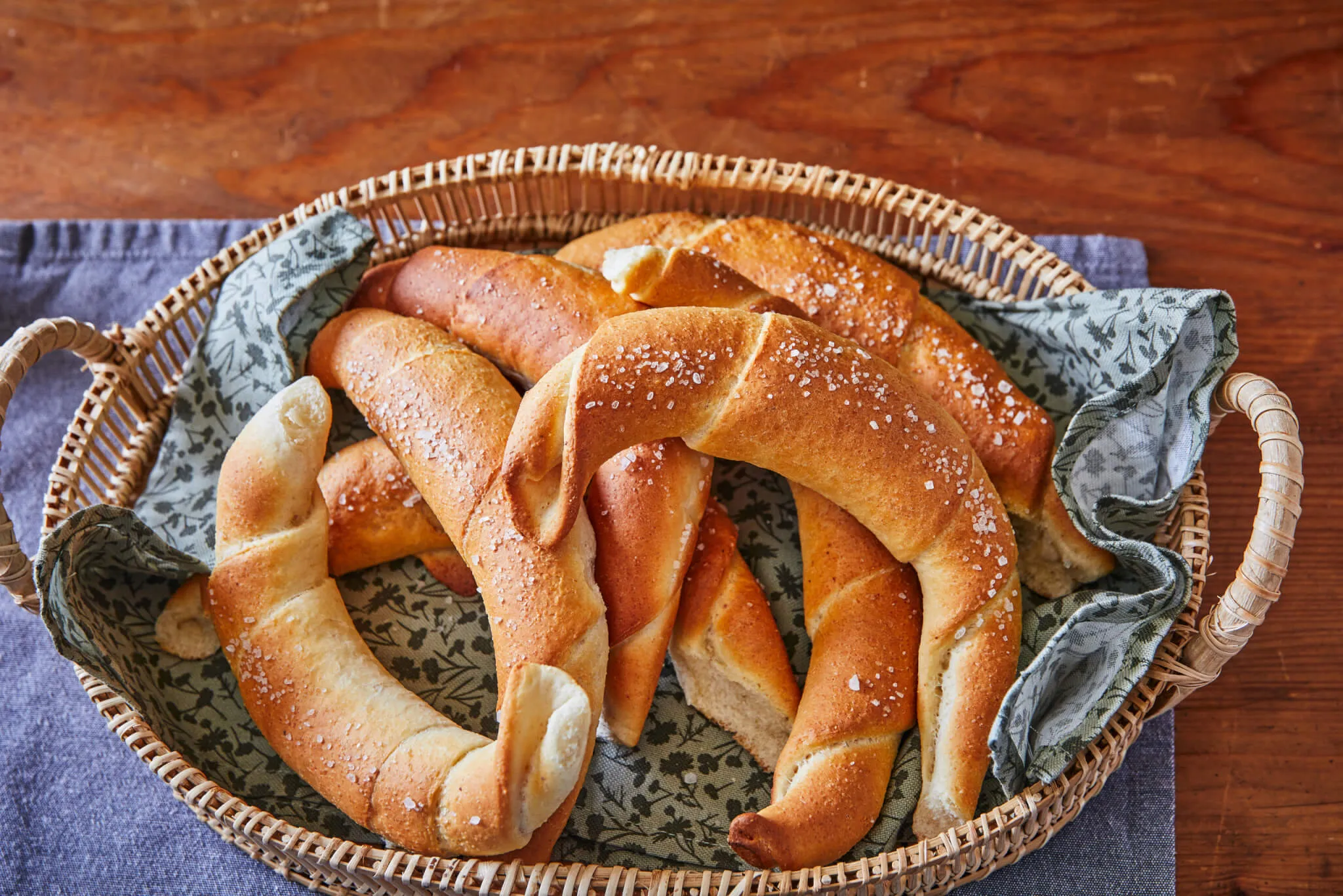 A felületüket finoman beecseteljük vízzel, megszórjuk nagy szemű, kristályos sóval, majd 230 fokra előmelegített sütőben, alsó-felső sütéssel kb. 12 perc alatt készre sütjük. Ha kivettük a sütőből, bepermetezzük egy kis vízzel és hagyjuk kihűlni.