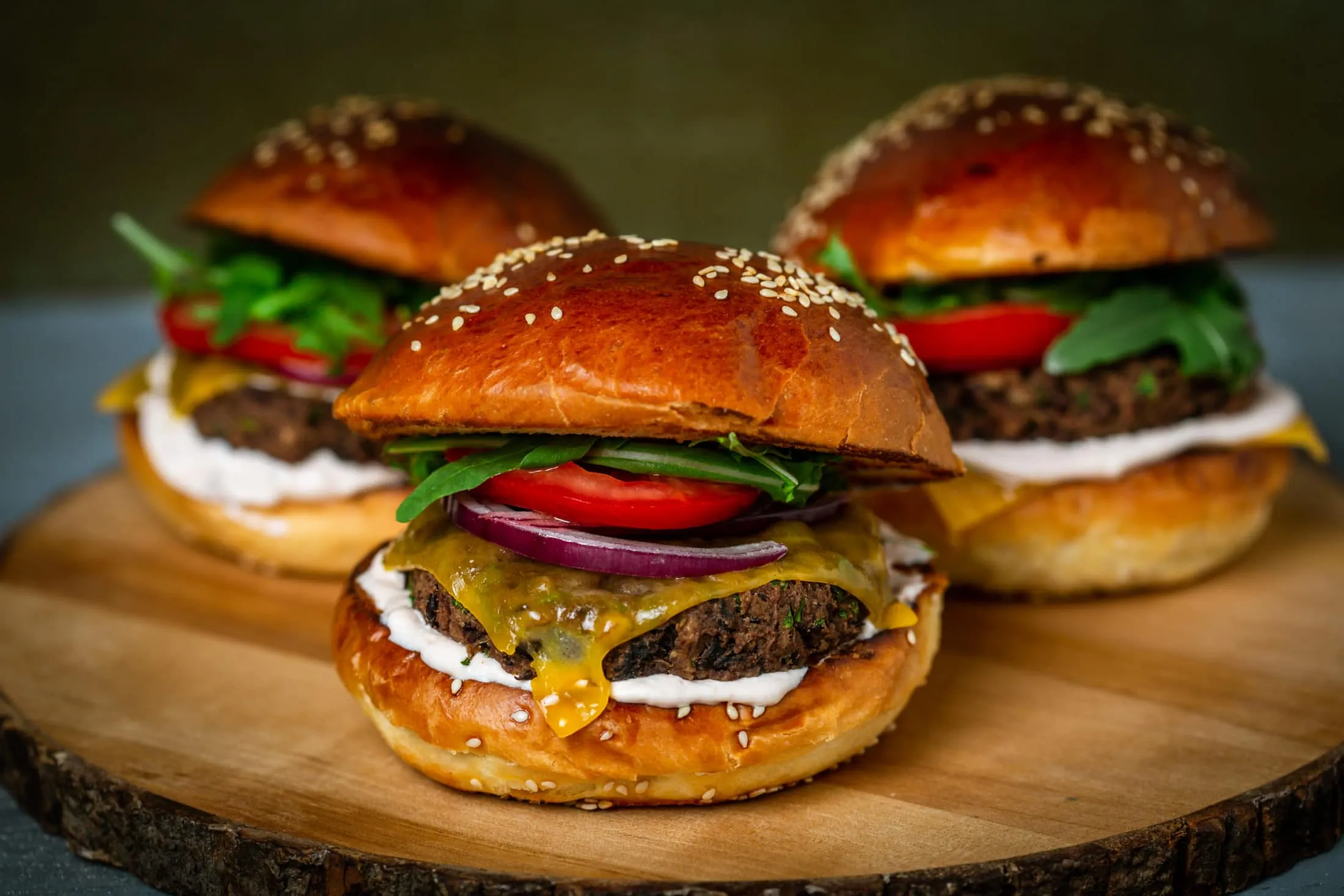 Az olajon az apróra vágott vörös és fokhagymát lepirítjuk, közben szintén apróra vágjuk a gombafejeket is, majd ez is mehet a hagymákhoz. Sózzuk, borsozzuk, és ha a gomba is kissé összeesett, elzárjuk a serpenyő alatt a lángot. A babkonzervet leszűrjük, majd a babot villával rusztikusra törjük. Mehet hozzá a gombás - hagymás alap, apróra vágott petrezselyem, tojás, zsemlemorzsa és az oregáno is. Alaposan összedolgozzuk, majd 4 részre osztjuk, hamburgepogácsa alakúra formázzuk és sütőpapíros tepsin, 180 fokos sütőben kb. 15 perc alatt készre sütjük őket, és még forrón rádobunk mindegyikre 1-1 szelet sajtot. A mártás hozzávalóit összekeverjük, a hamburgerzsemléket pedig félbevágjuk, és egy száraz serpenyőben lepirítjuk a vágott felüket. A zsemlék aljára jöhet egy kis mártás, rá a hamburgerpogácsa, paradicsom, hagyma, rukkola, majd a zsemlék tetejével zárjuk a sort.
