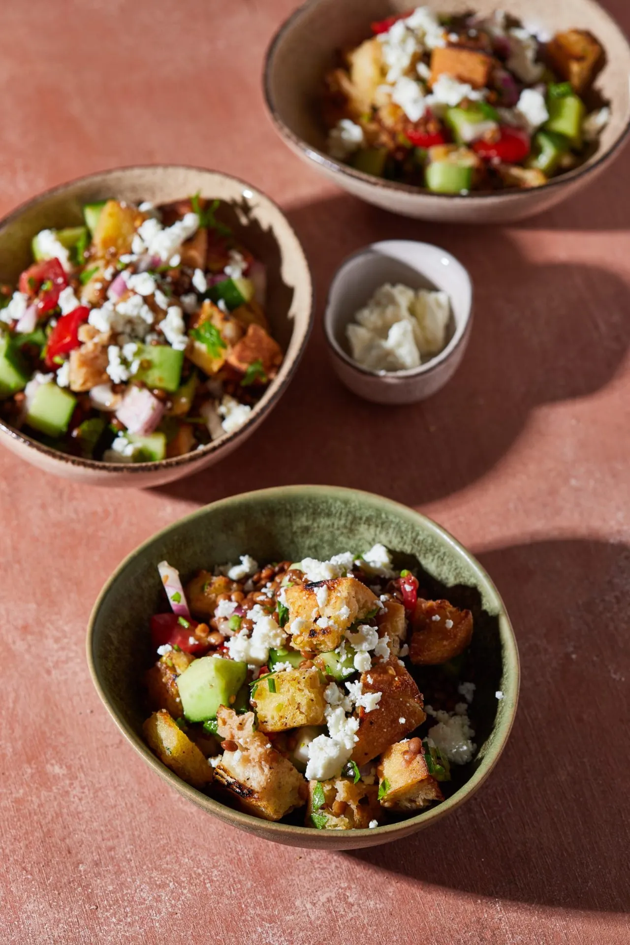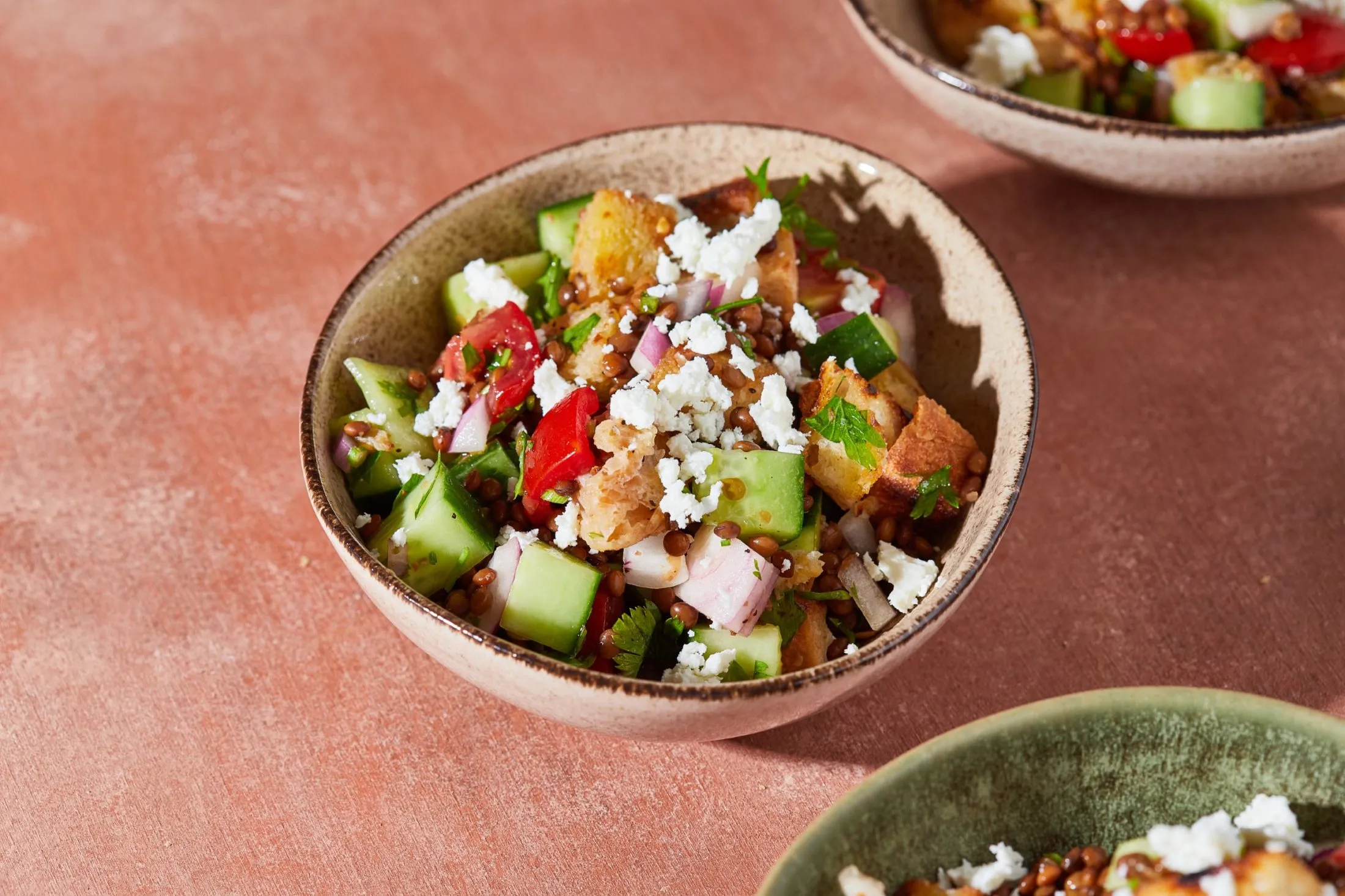 A lencsét leszűrjük. A kenyérkockákat 2-3 cm-es darabokra vágjuk, és egy száraz serpenyőben egy kevés olajon megpirítjuk. Sózzuk, borsozzuk. A zöldségeket kisebb kockákra vágjuk, a petrezselymet felaprítjuk, és az egészet összeforgatjuk egy kevés olajjal, ecettel, sóval, borssal. Rámorzsoljuk a sajtot, és tálaljuk.