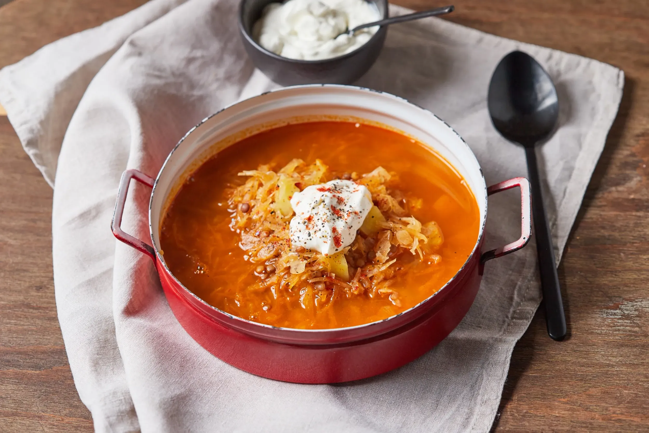 Rárakjuk a lecsepegtetett, durvára vágott káposztát (ha nem szeretitek savanykásan, akkor mossátok át), majd 2-3 perc pirítás után megszórjuk a füstölt paprikával, hozzáadjuk a babérlevelet, az őrölt köményt, és felöntjük az alaplével.