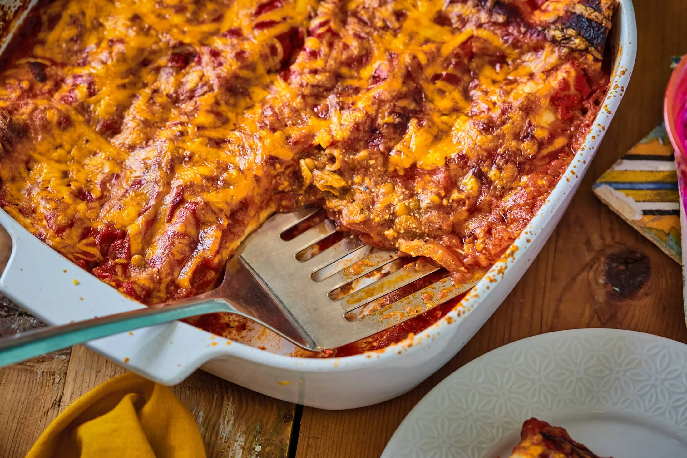 A tetejére a szószhoz az olajon lepirítjuk a zúzott fokhagymát, belerakjuk a cheddar kivételével a többi hozzávalót, és 10 perc alatt beforraljuk. Leöntjük a mártással a megtöltött tortillákat, megszórjuk a tetejét reszelt sajttal, és 180 fokra előmelegített sütőben 30 perc alatt megsütjük.