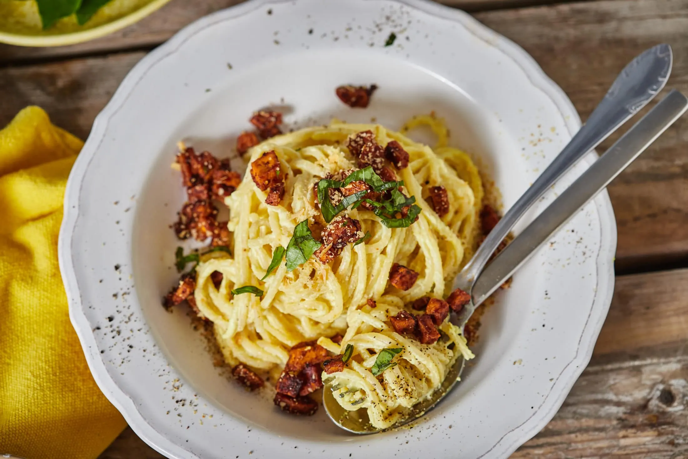 Mikor a tészta megfőtt, leszűrjük, majd egy serpenyőben összekeverjük a kamu carbonara szósszal, és pár perc alatt összemelegítjük alacsony lángon. Ezután tálalhatjuk is a tésztát: mehet a tetejére bőven a tofuból, majd sörélesztőpehellyel és apróra vágott bazsalikommal megszórva kínáljuk.