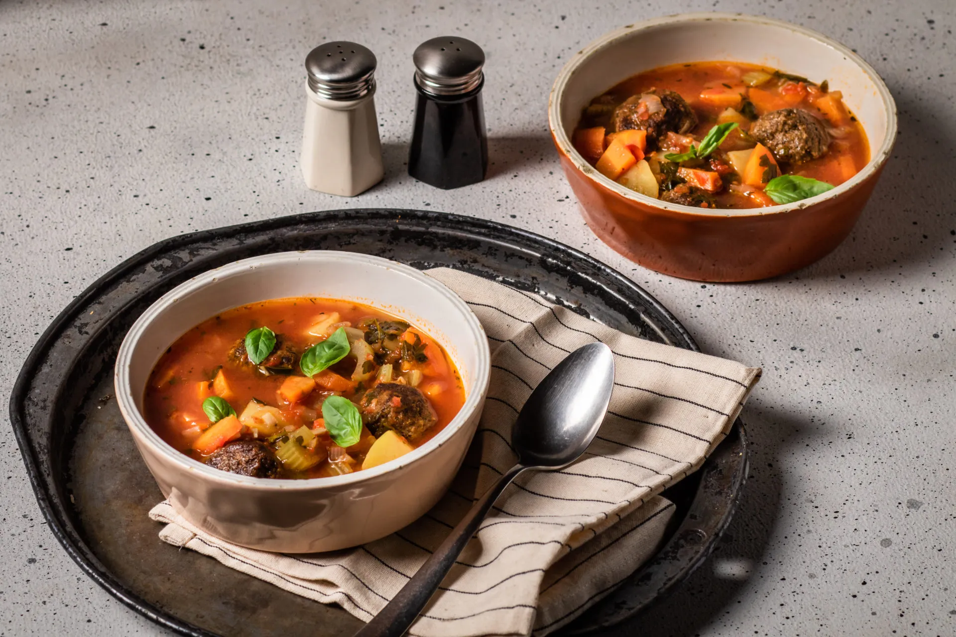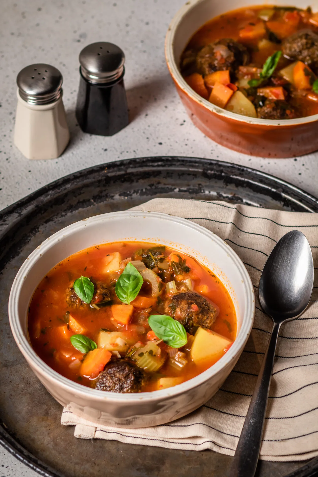 A leveshez az olajon üvegesre pároljuk az apróra vágott hagymát és a felszeletelt fokhagymát. Sózzuk, borsozzuk, megszórjuk a fűszerekkel és a bazsalikomot is beletépkedjük. Rárakjuk a kis kockákra vágott répát, zellert és krumplit. Felöntjük az alaplével, felforraljuk, és addig rotyogatjuk, amíg a krumpli meg nem puhul. A golyókat a levesben tálaljuk.