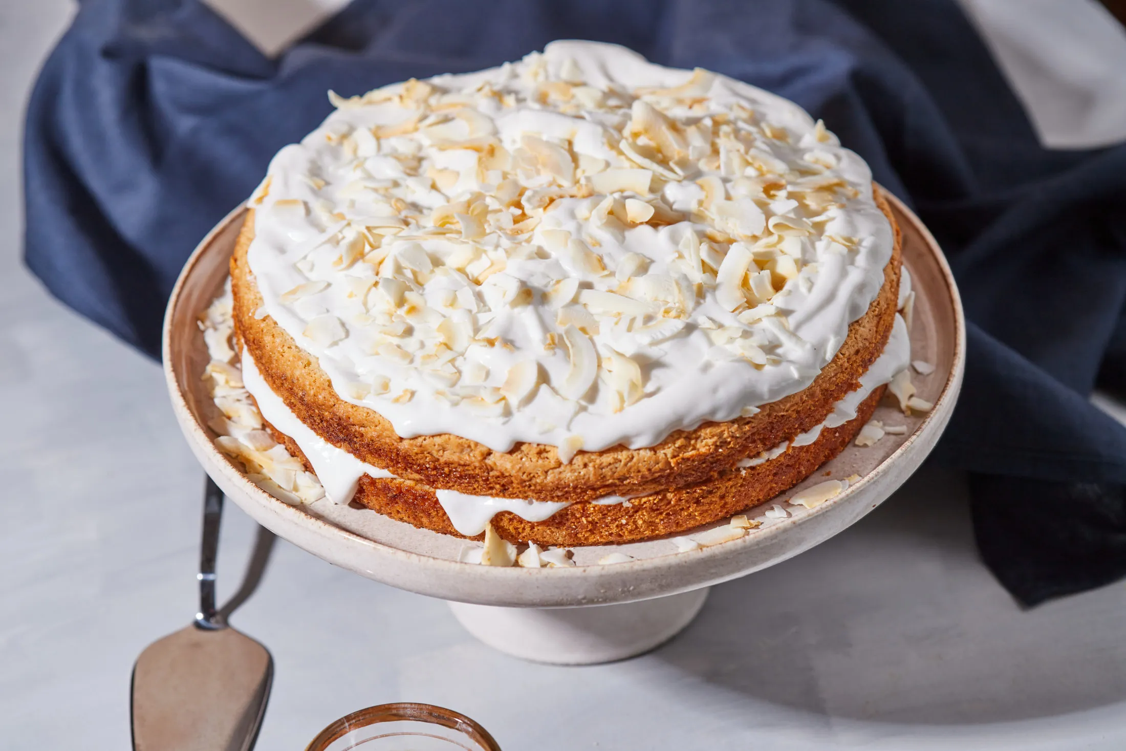 A jól behűtött kókuszkonzerveket kinyitjuk, és a felső, szilárdabb, hófehér kókuszkrémet egy tálba rakjuk, majd a porcukorral, magas fokozaton kb. 5-7 perc alatt kihabosítjuk. Egy keveset kenünk a két lap közé a krémből, a többit pedig eloszlatjuk a süti tetején, és bedobjuk a hűtőbe. A kókuszchipset egy serpenyőben kissé lepirítjuk, majd ha kihűlt, ezzel szórjuk meg a süti tetejét.