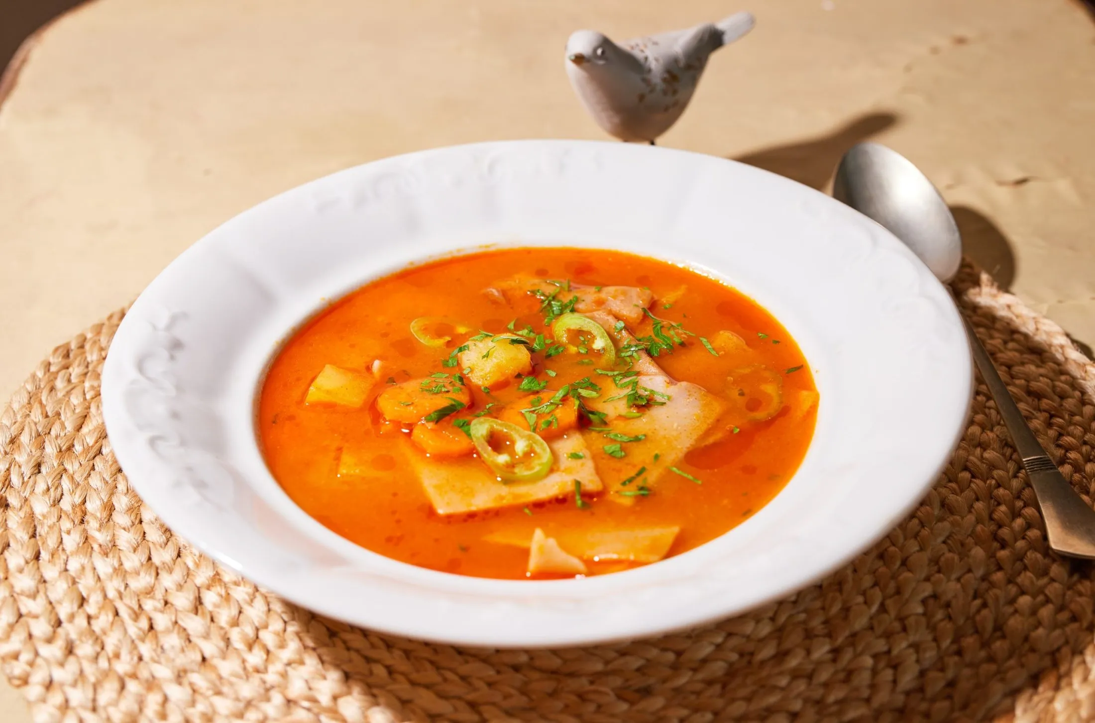 Ha lepirult, megszórjuk a fűszerekkel, beletesszük a sűrített paradicsomot, és enyhén ezt is lepirítjuk, majd felöntjük 2 liter vízzel. Ha minden összetevő megpuhult, összeturmixoljuk, majd beletesszük a felkockázott krumplikat és a felkarikázott sárgarépát, amiket háromnegyedig főzünk, majd a tésztát hozzáadva készre főzzük. Tálaláskor kis friss petrezselymet szórunk rá és meglocsoljuk paprikás olajjal.