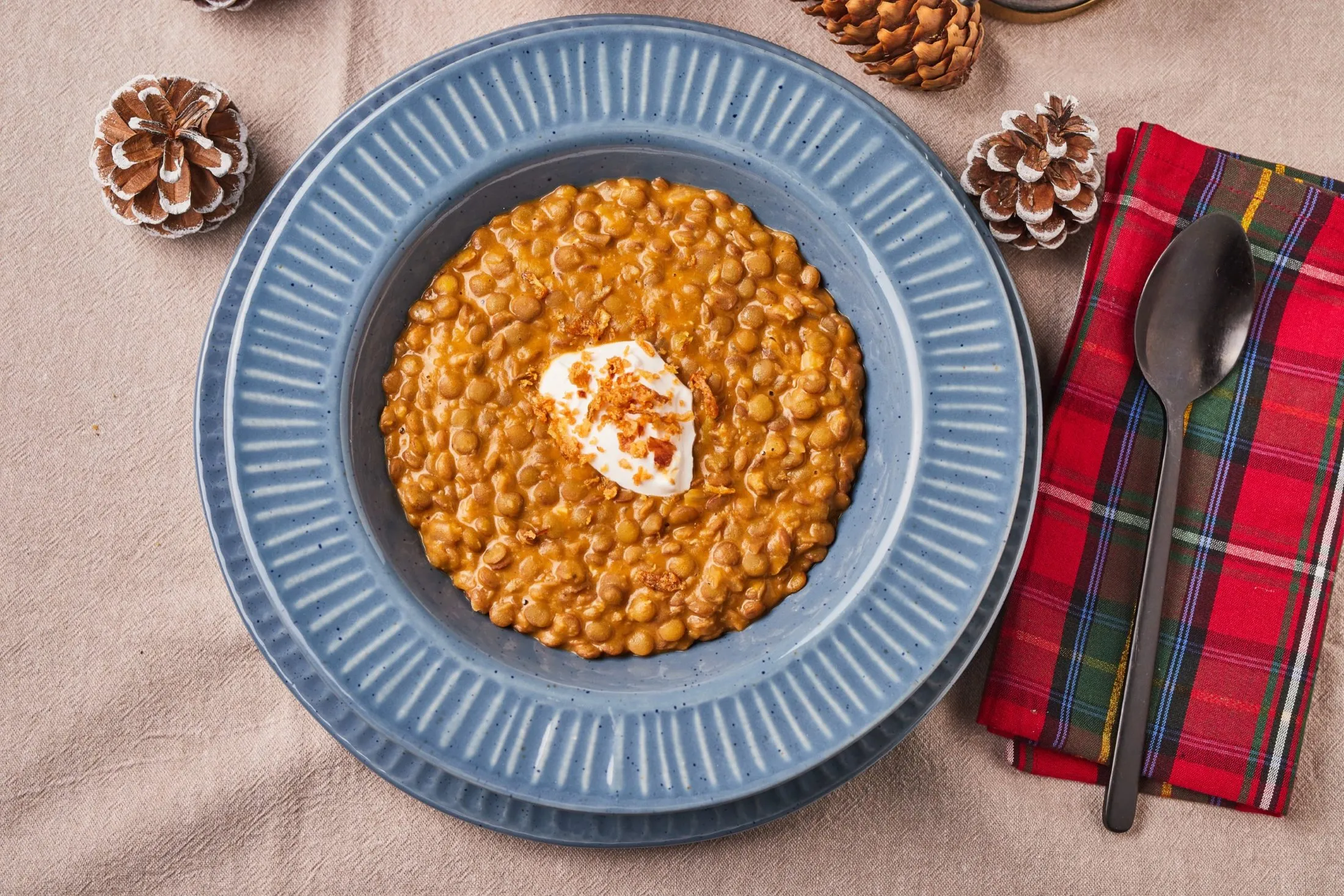 A lencsét beáztatjuk 1-2 órára, majd átmossuk, és leszűrjük. A kókuszolajon üvegesre pároljuk az apróra vágott hagymát és fokhagymát, majd megszórjuk a pirospaprikával, beledobjuk a babérlevelet, sót és borsot, majd beleszórjuk a lencsét, és felöntjük a zöldségalaplével vagy vízzel.