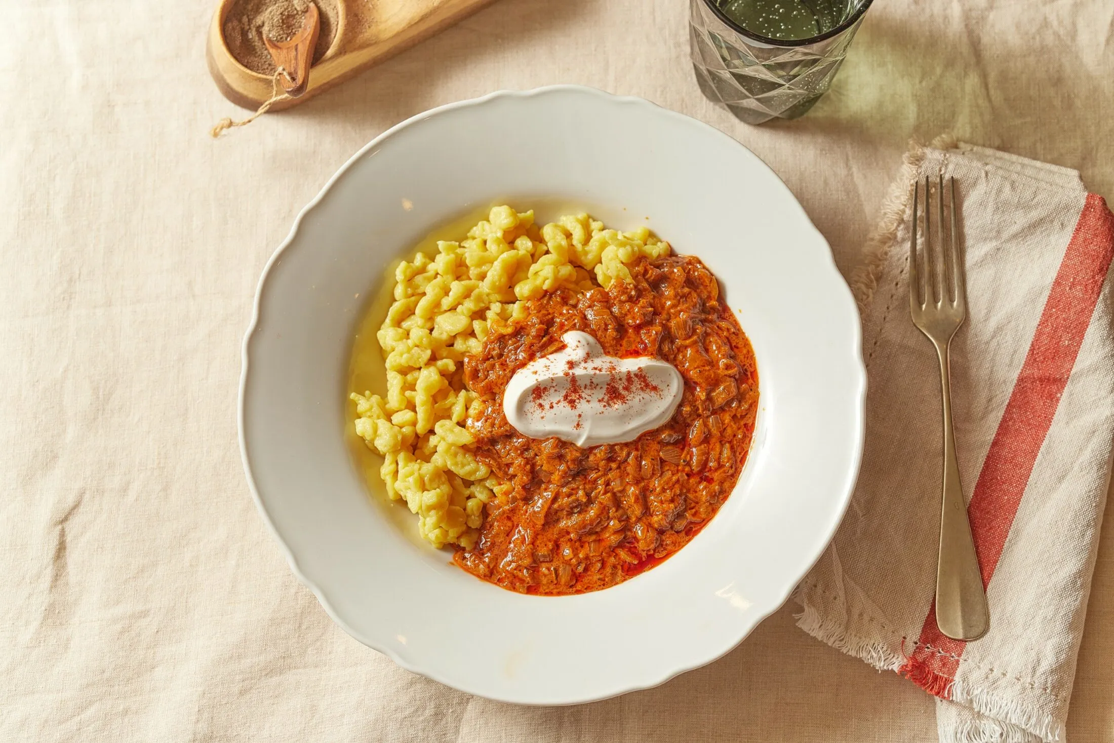 Amíg elérjük a szükséges sűrű, pörköltszaftszerű állagot, addig elkészítjük a nokedlit. Ehhez a lisztet, a vizet, a sót, a kurkumát és az olajat csomómentesre keverjük, majd lobogó vízbe szaggatjuk és 1 perc alatt kifőzzük. Közben a besűrűsödött szafthoz adjuk a növényi tejföl-alternatívát, elkeverjük, és jöhet is a tálalás.