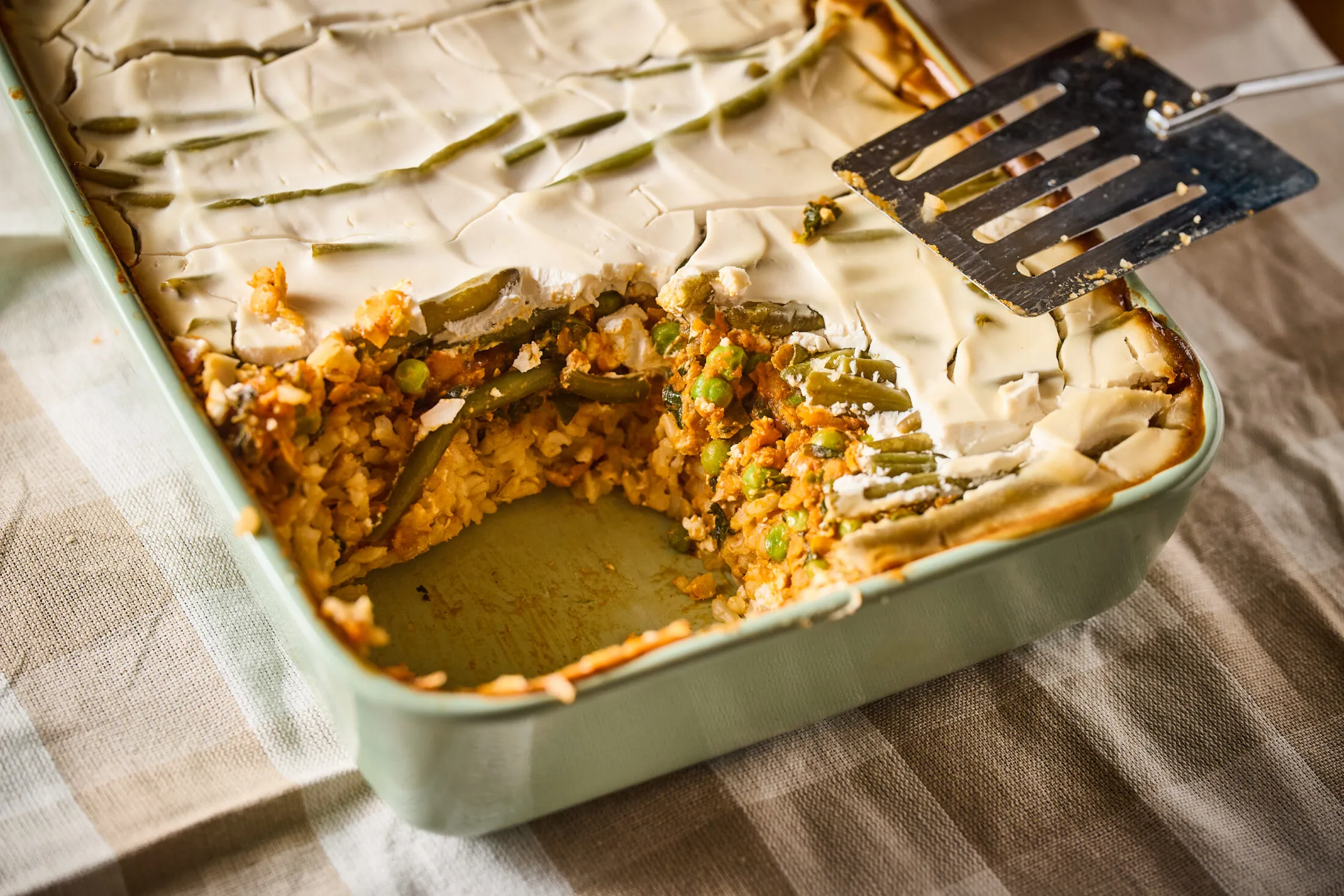 A rizst belekanalazzuk egy tepsibe és egyenletesen eloszlatjuk benne. Erre mehet szintén egyenletesen elkenve a vörös lencsés ragu, végül a tetejére pakoljuk a kiolvasztott zöldbabot. A vegafölt kikeverjük, hogy kicsit kenhetőbb állaga legyen és lekenjük vele a rakottas tetejét. 180 fokra előmelegített sütőben 40 perc alatt készre sütjük.
