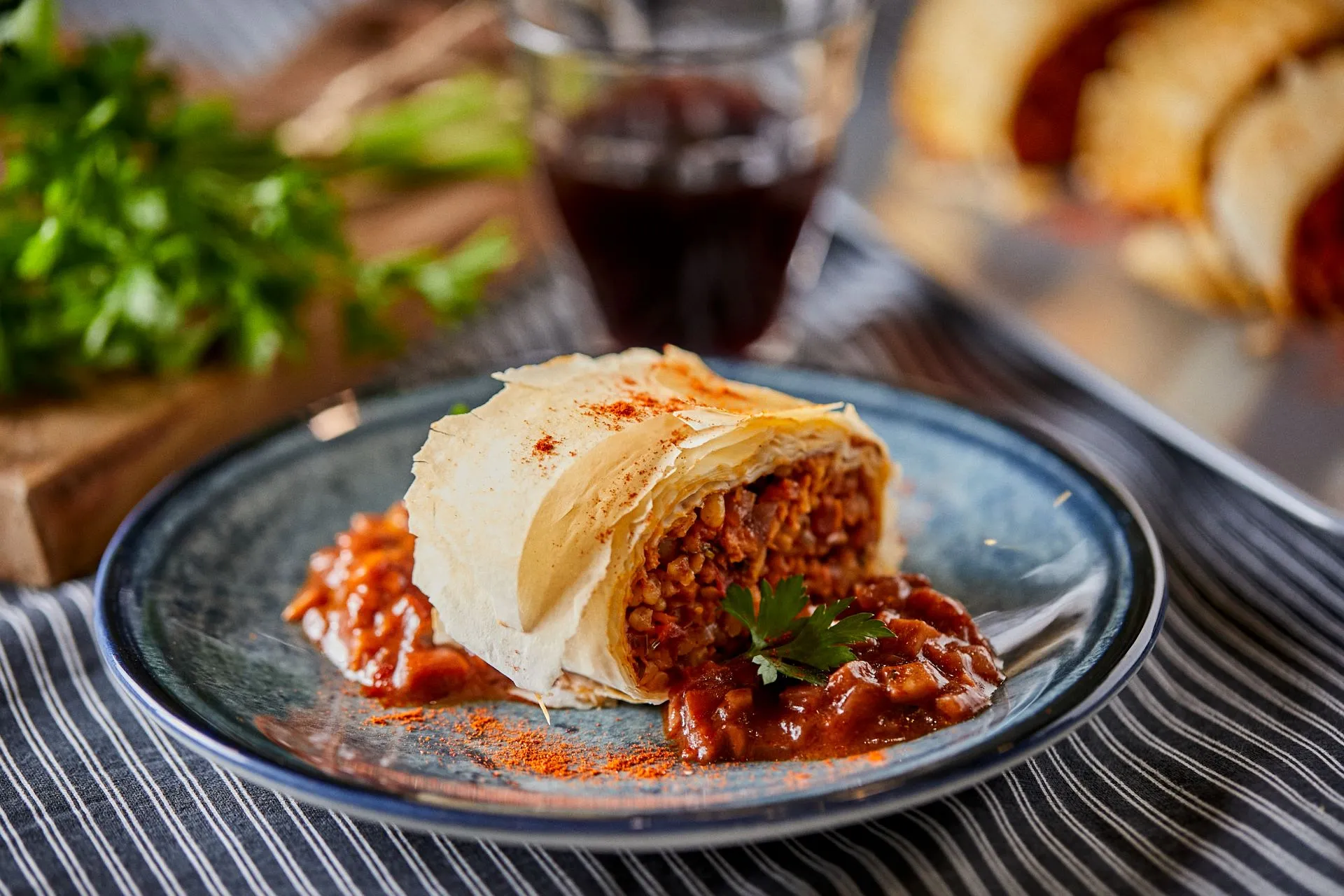 A kész vegán rétest hagyjuk 10 percet pihenni, majd egy éles késsel felszeletelhetjük, és a mártással tálaljuk.