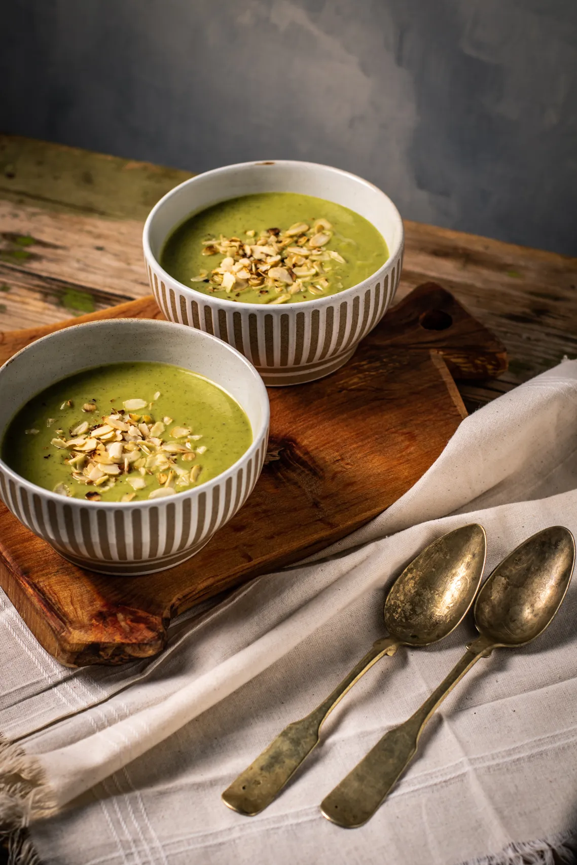 Leturmixoljuk, hozzáadjuk a sörélesztőpelyhet, a kesutejet és a citromlevet, és pirított mandulával megszórva tálaljuk.