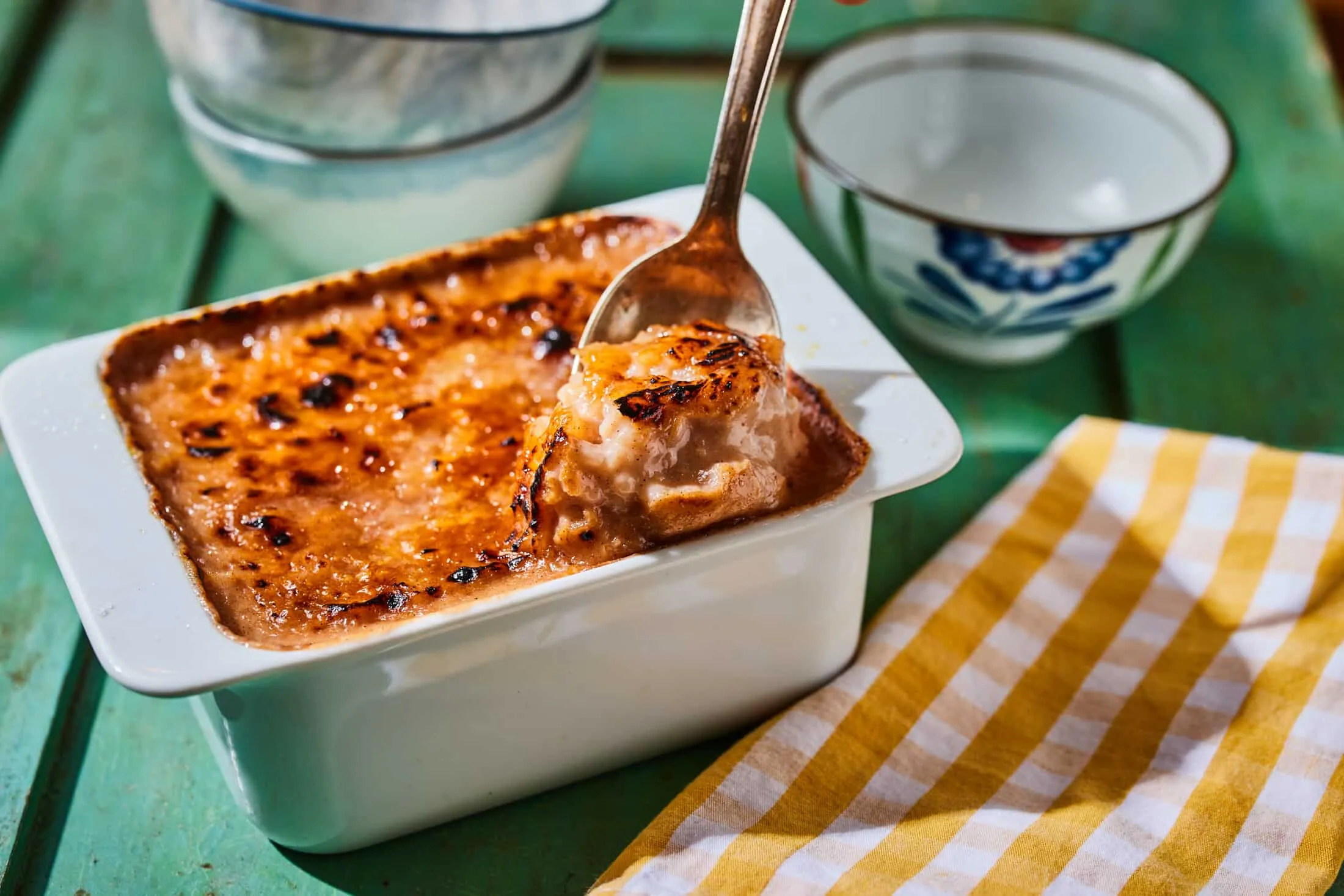 Egy kisebb sütőformába öntjük a masszát, megszórjuk a tetejét a maradék cukorral, és 180 fokra előmelegített sütőben 15-18 percig sütjük. Ezután átkapcsolunk grillfunkcióra, feldobjuk a legfelső rácsra a sütőben, és még 3-5 percig sütjük, hogy a tetején a cukor szépen megkaramellizálódjon.