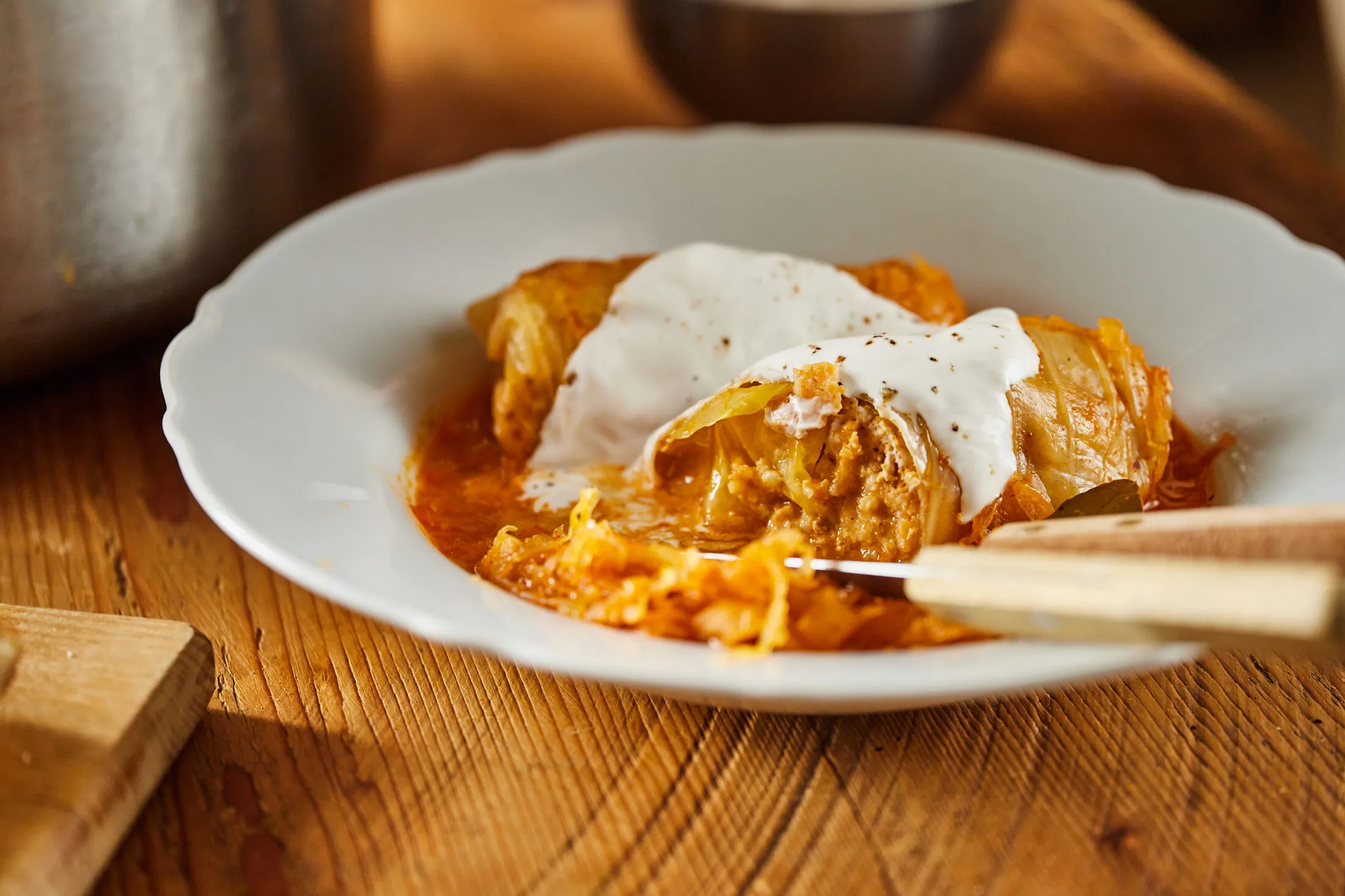 A kitálalt adagokat alaposan megpakoljuk vegán tejföllel, majd frissen őrölt borssal és kenyérrel kínáljuk.
