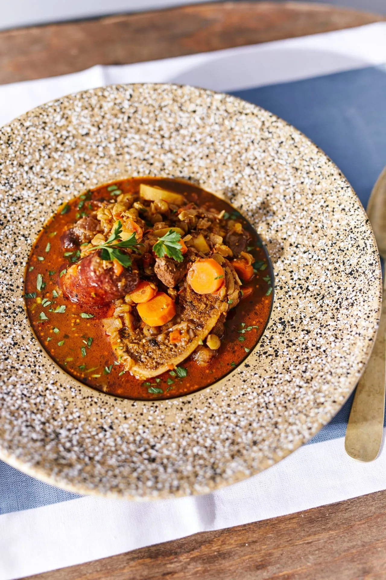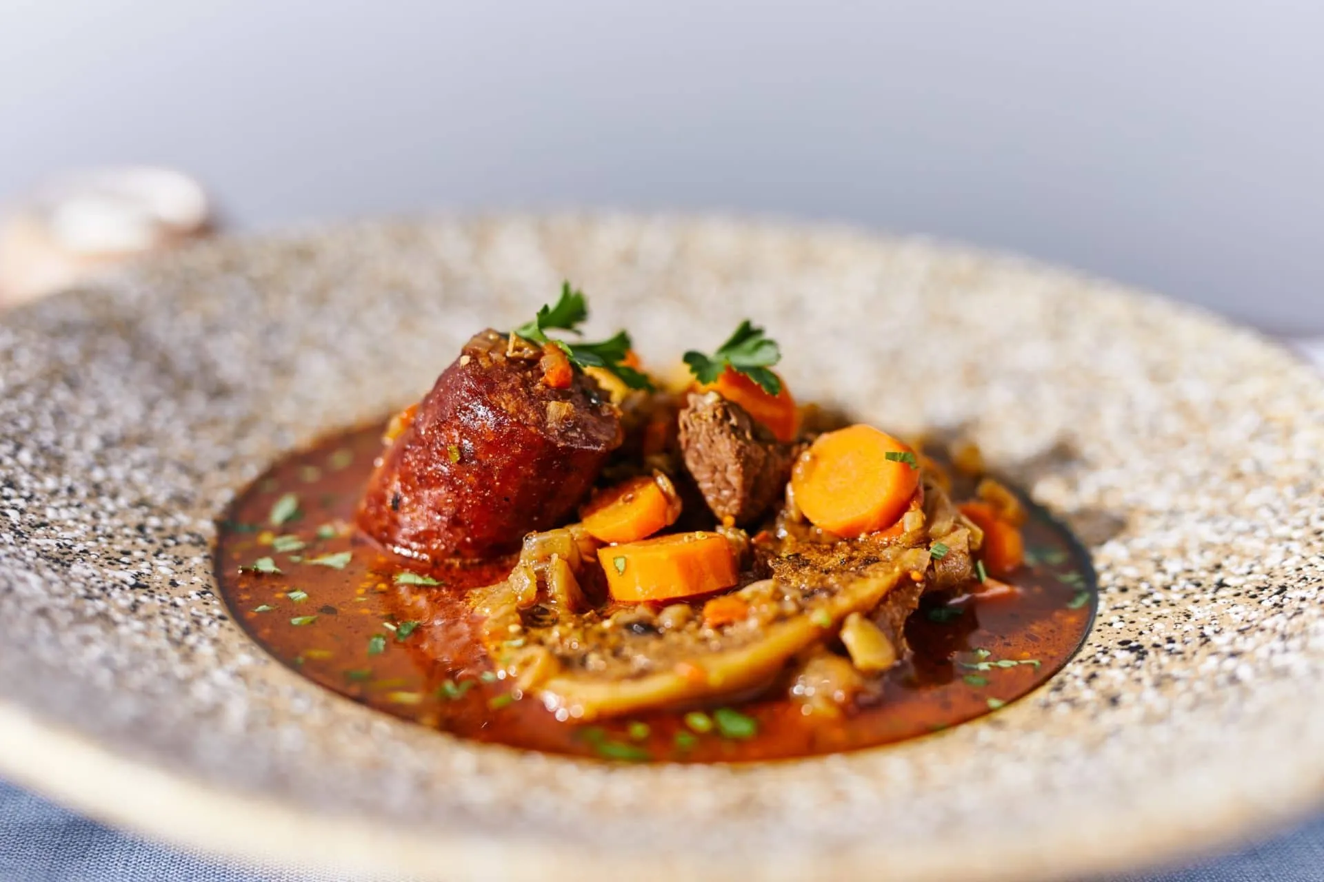 Az apróra vágott hagymát, fokhagymát és kápia paprikát lepirítjuk a zsíron, majd hozzáadjuk a felkockázott marhahúst, és zsírjára pirítjuk. Amikor a hús is kapott egy kis színt, félrehúzzuk a lábost, sózzuk, borsozzuk, rátesszük a füstölt paprikát és a fűszerköményt. Hozzádobjuk a kockázott paradicsomot, a velős csontot, a babérlevelet, a mustárt, az aprított rozmaringot és a kolbászt, ráöntjük a vörösbort, majd addig rotyogtatjuk, amíg a felére nem redukálódott.