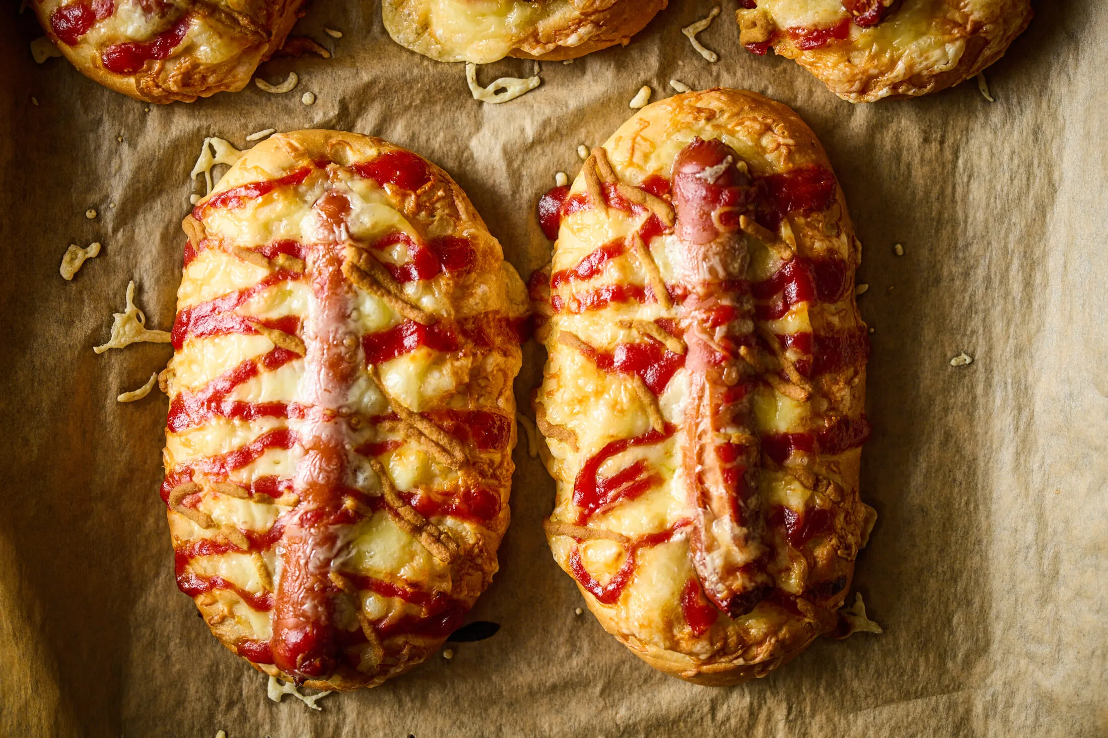 A tésztacsónakok tetejét lekenjük egy kevés vízzel, megszórjuk őket a reszelt sajttal és a közepükbe kissé belenyomkodjuk a virsliket. Nyomunk a tetejükre a ketchupból, a mustárból, és 180 fokra előmelegített sütőben kb. 20 perc alatt készre sütjük őket.